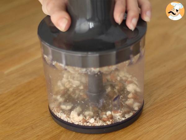 Taiati-le in bucati mici cu un cutit sau intr-un chopper, punand deoparte 3 alune, pe care le taiati in jumatate.