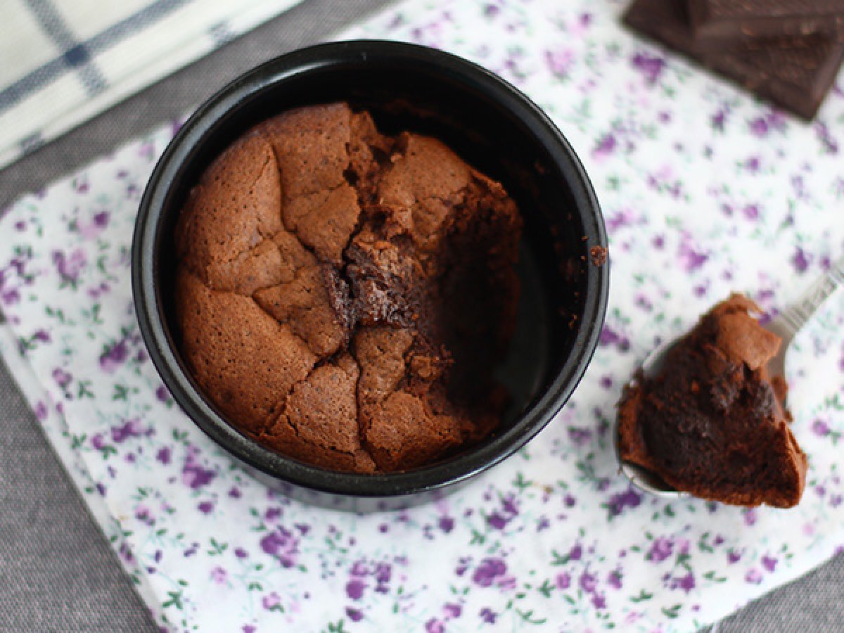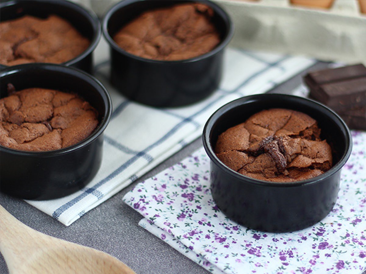Se toarna amestecul in ramekins unse in prealabil si se coace timp de 10 minute la 200°C. Coaceti numai 6 - 7 minute pentru o un fondant care curge.
