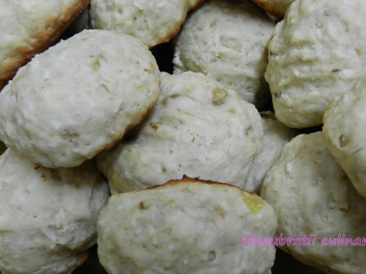 Fursecuri cu banane și nucă de cocos PrecedentulUrmătorul DesertFoarte ușor45 min Trimite unui prieten Printează pagina Adresează o întrebare autorului Postează o poză cu rețeta gătită de tine Un desert foarte sățios... Ingrediente 8 2 banane mari foarte copte, 2 ouă, 3+1 linguri ulei, 500 g făină, 10 g praf de copt, 75 g nucă de cocos, 150 g zahăr tos, o linguriță esență de vanilie, un praf de sare.