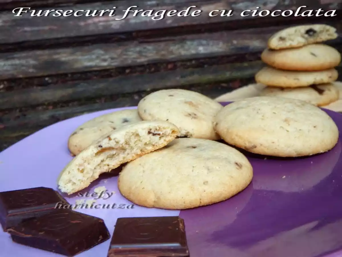 Fursecuri fragede cu ciocolata DesertFoarte ușor30 min Trimite unui prieten Printează pagina Adresează o întrebare autorului Postează o poză cu rețeta gătită de tine Forte fragede Ingrediente 15 Pentru circa 40 de fursecuri : 125 g unt (la temperatura camerei) 2 oua 100 ml ulei 160 g zahar 1/2 plic praf de copt 16 linguri cu varf de faina 8 patratele de ciocolata amaruie Un plic zahar vanilat O picatura de esenta de lamaie Coaja de la o lamaie (eu nu am pus caci am uitat sa cumpar)