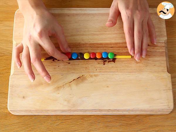 Ungeti paiul cu ciocolata topită si puneti M&M-urile pe el. Ridicati paiul si sustineti-l pe 2 pahare.