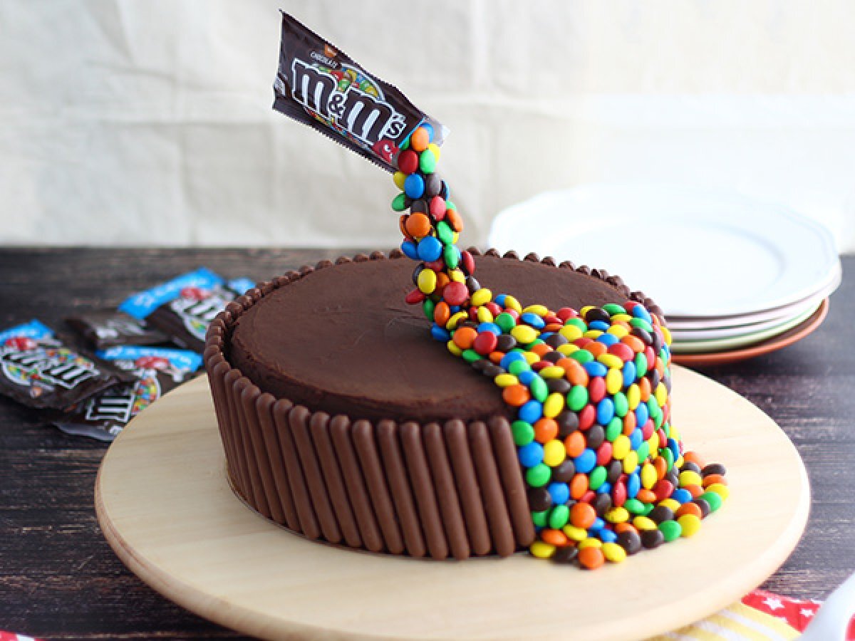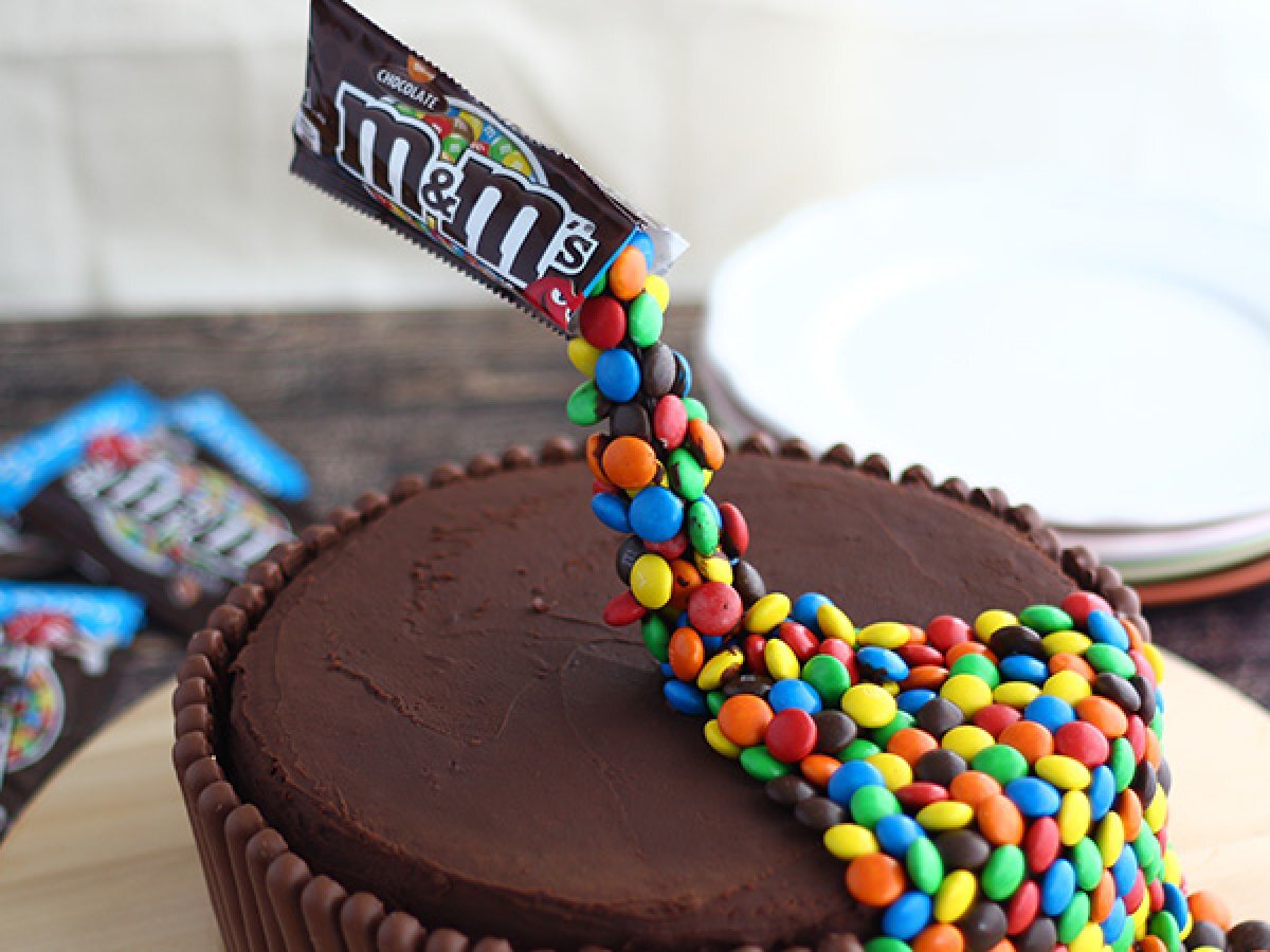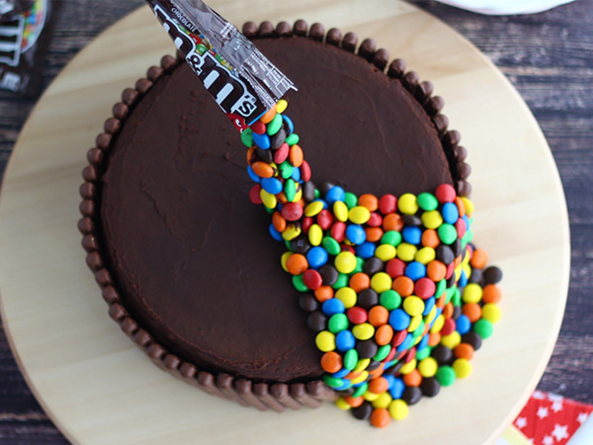 Lipiți M&M's pe partea goala a tortului, ganache-ul va servi drept lipici.