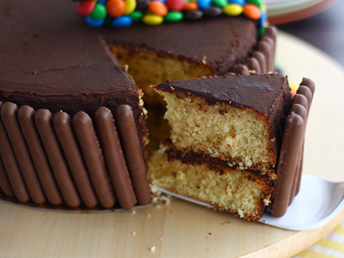 Lipiți biscuitii tip degete (sau kit-kat) în jurul tortului, lăsând un spațiu gol de aproximativ 2 părți.