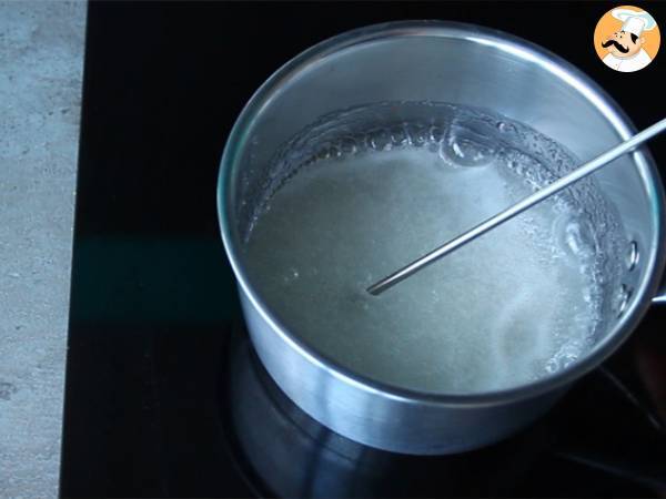 Într-o cratita adaugati zahar, apa si esenta de lamaie. Aduceti la fierbere si puneti termometrul in amestec: temperatura trebuie sa ajunga la 115° C.