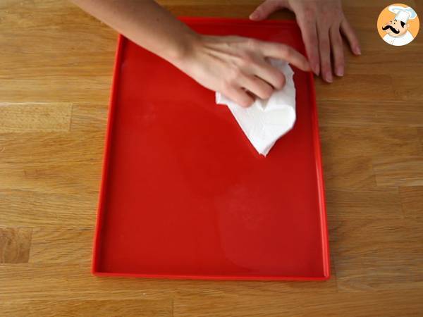 Ungeti placa de silicon cu un servet de hartie inmuiat in ulei, sau pe o tava normala de copt puneti cu hartie de pergament). Incalziti cealalta jumatate de amesct necolorat timp de 30 de secunde in cuptorul cu microunde sau la la bain-marie.
