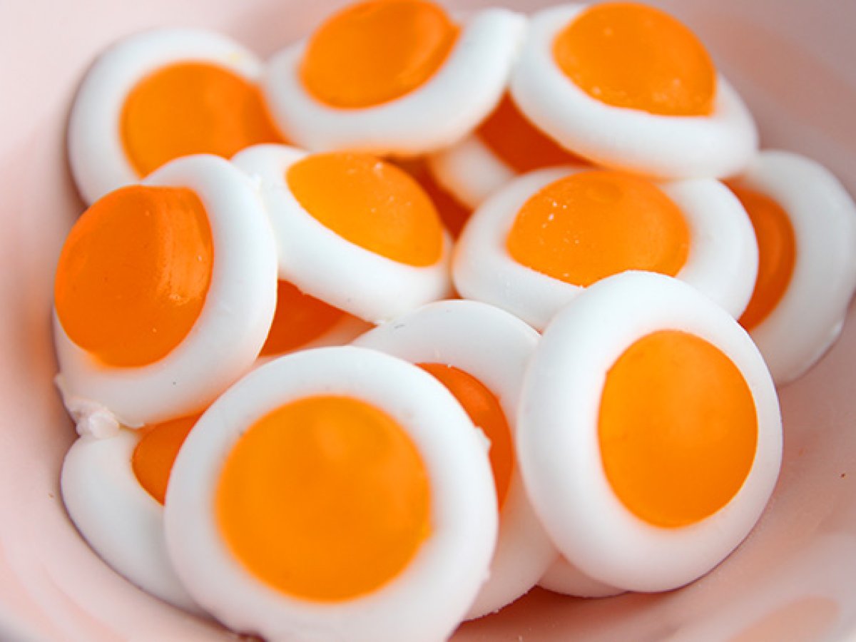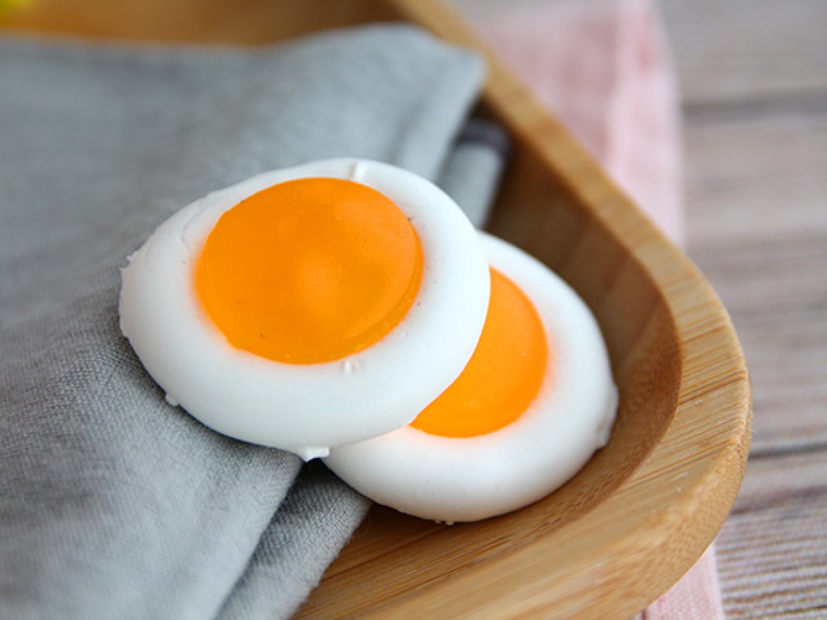 Folosind un servetel de hartie inmuiat in ulei, ungeti semisferele de silicon. Turnati amestecul galben in cantitati mici in formele de silicon. (Daca amestecul este prea tare, incalziti-l usor la bain-marie.) Lasati la uscat peste noapte.