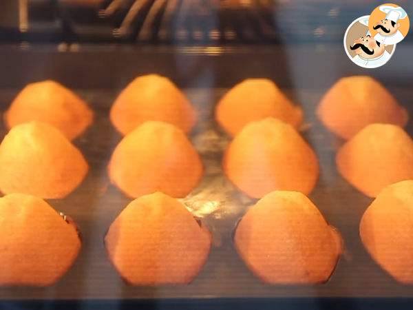 Incalziti cuptorul la 220° C si coaceti timp de 6 minute la 220° C apoi inca 6 minute la 180° C. Lasati sa se raceasca si scoateti madeleines din forme. Dati-le deoparte.