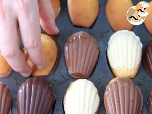 Dati la rece, la frigider timp de cel putin 30 de minute, astfel ciocolata se la lipi de madeleines.