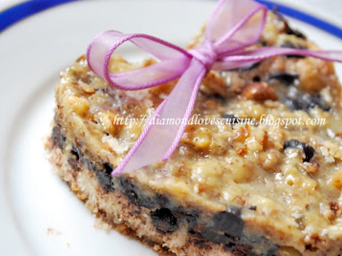 Magic bars - sau prajitura magica PrecedentulUrmătorul DesertFoarte ușor55 min Trimite unui prieten Printează pagina Adresează o întrebare autorului Postează o poză cu rețeta gătită de tine Ingrediente 8 120 g. unt topit 150 g. biscuiti - eu am folosit cu ovaz si c- iocolata- kaufland 90 g. fulgi de cocos 170 g. fulgi/picaturi de ciocolata 100 g. nuci sau alune de padure 1 conserva de lapte condensat - 396 g.