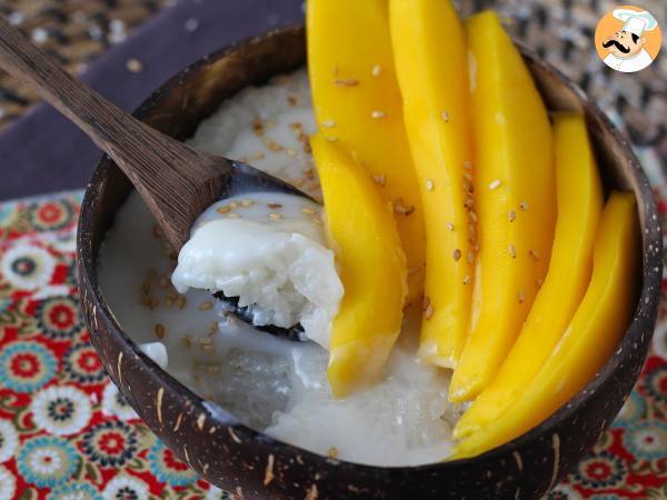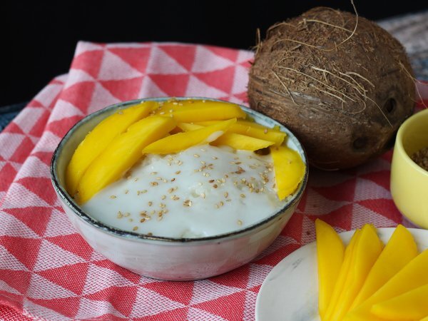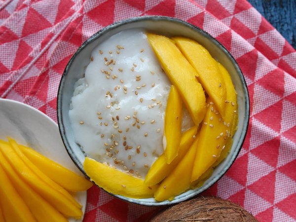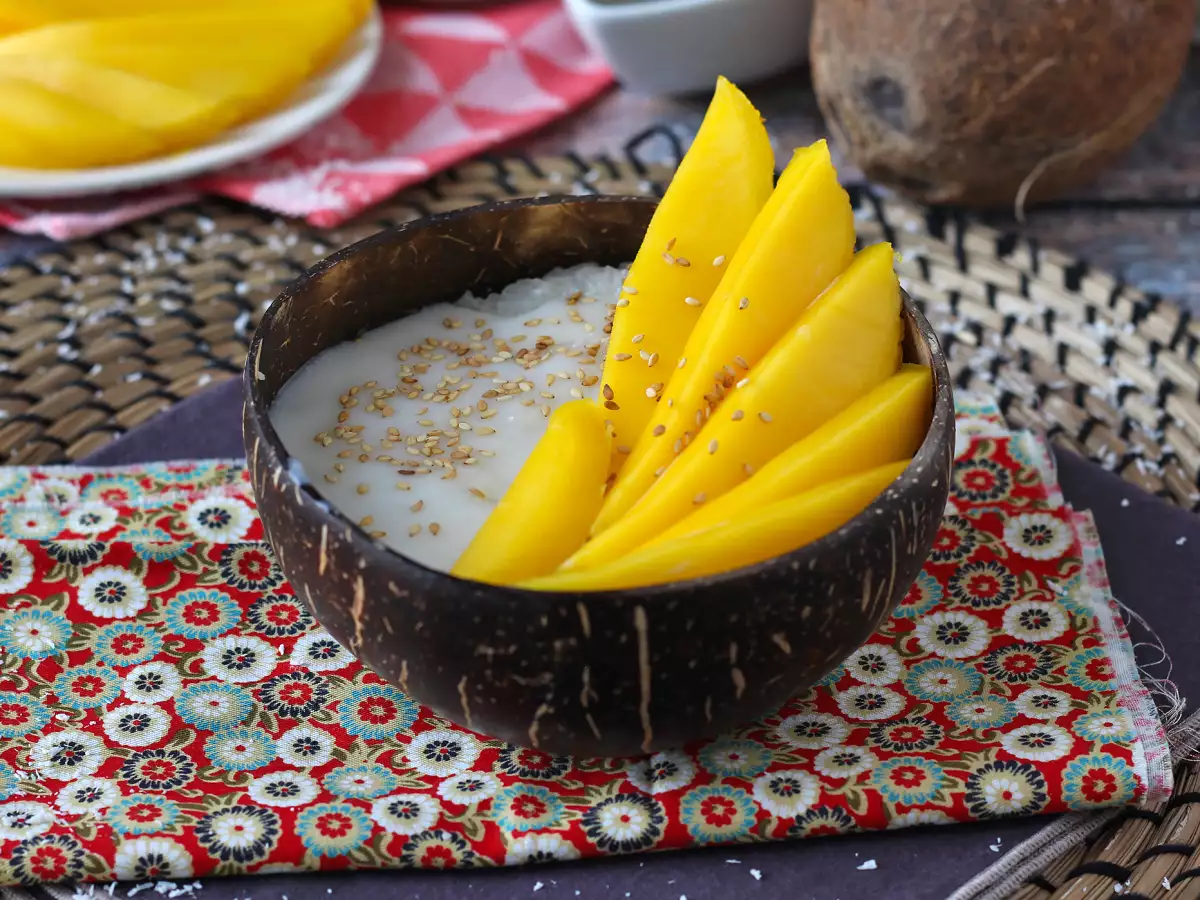 Mergeți în Thailanda pentru o explozie de dulceață și arome exotice! Răsfățați-vă cu faimosul mango sticky rice. Pentru culoare, lasă-te sedus de cremozitatea orezului sticky înmuiat în lapte de cocos, de galbenul strălucitor al mango-ului suculent și de albul cremos al sosului dulce. Pentru o notă de crocant, presărați semințe de susan sau fulgi de nucă de cocos. Un desert simplu, încântător, care te transportă la tropice dintr-o singură mușcătură!