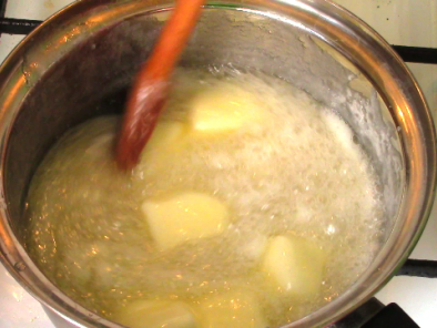 Se pregăteşte o tavă (nu prea mare), se unge cu unt şi se tapetează cu făina.
