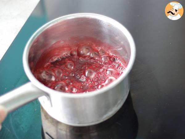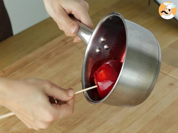 Intr-o cratita pusa la foc mare, puneti zaharul si adaugati putina apa, precum si cateva picaturi de colorant alimentar rosu (optional).