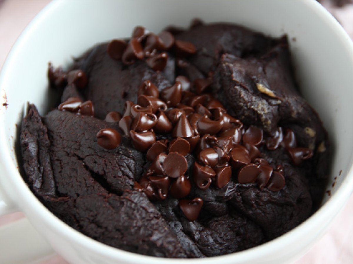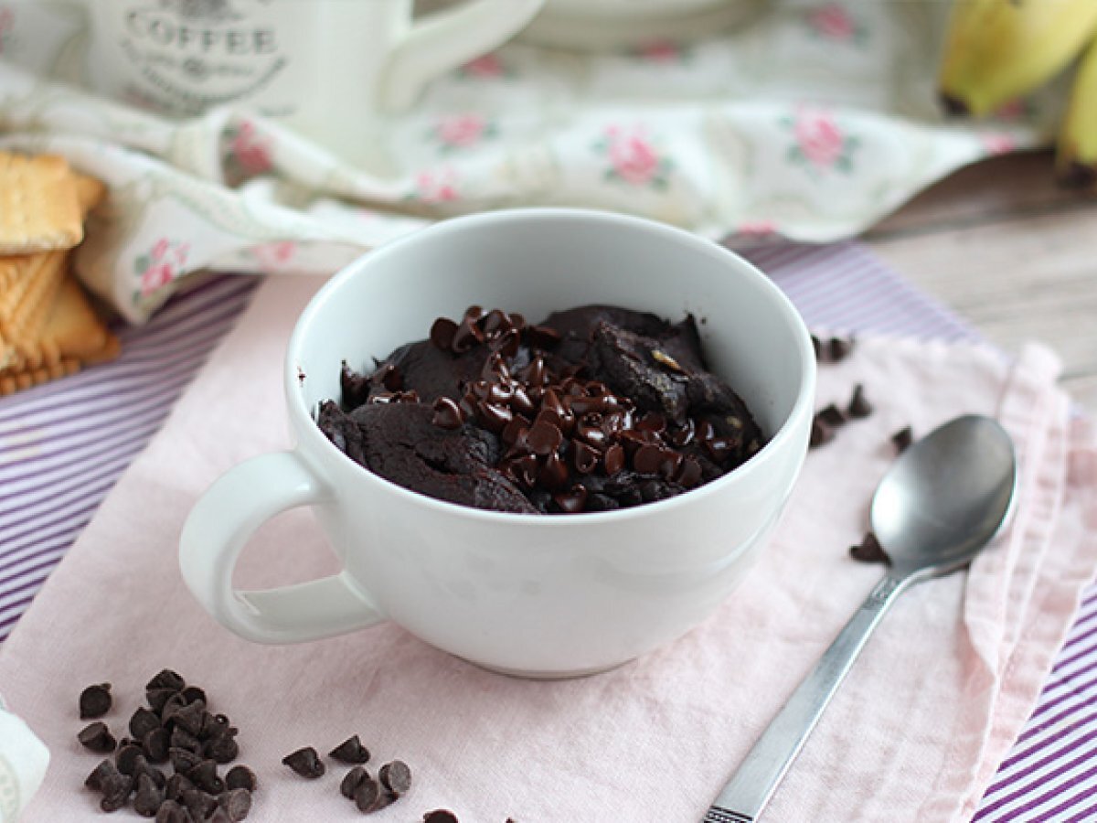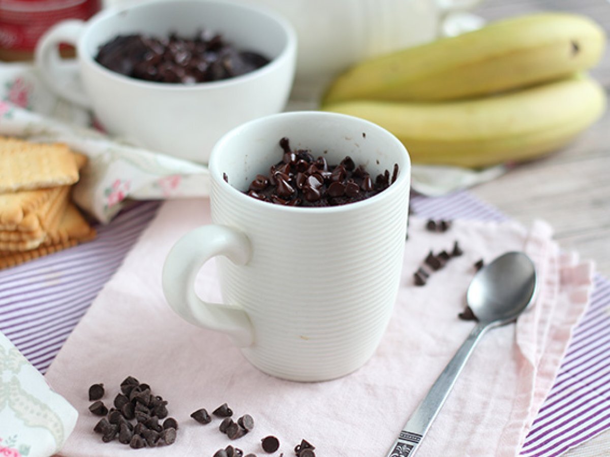 Turnati compozitia intr-o cana (special pentru microunde) si adaugati pepitele de ciocolata.