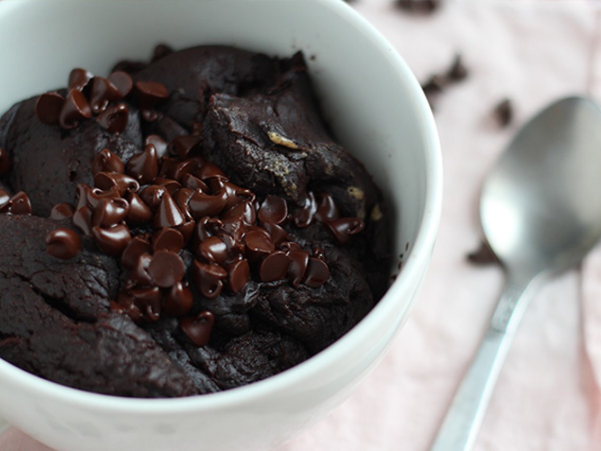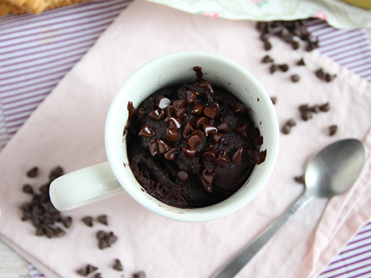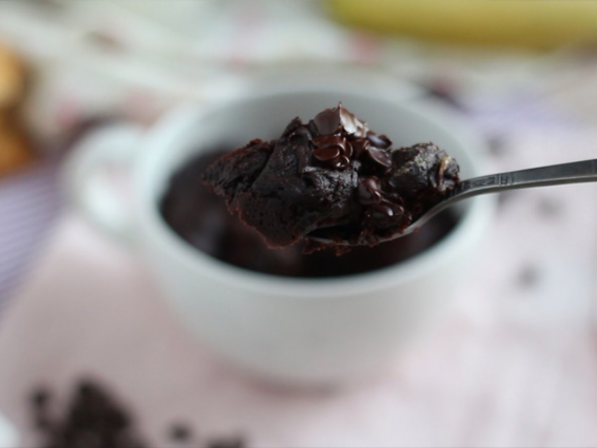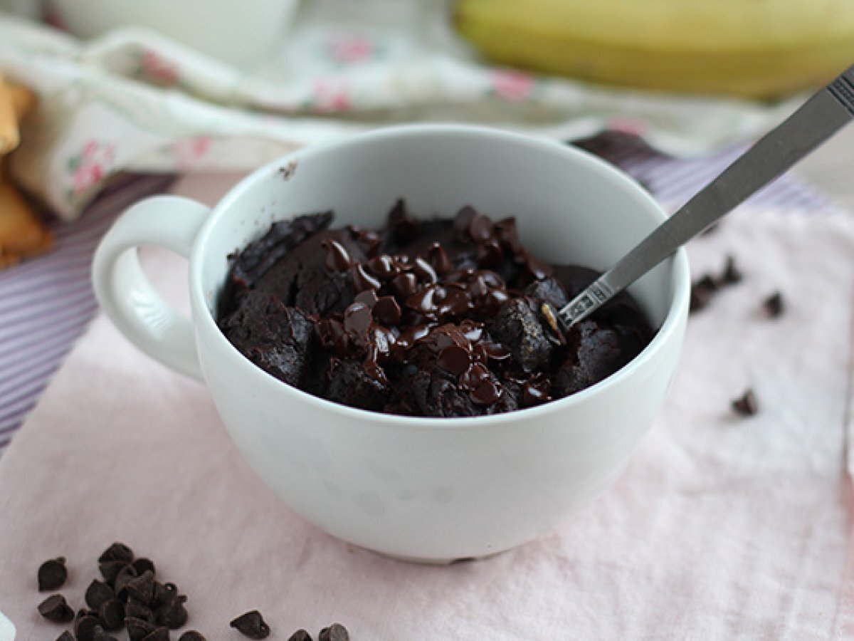Turnati compozitia intr-o cana (special pentru microunde) si adaugati pepitele de ciocolata.