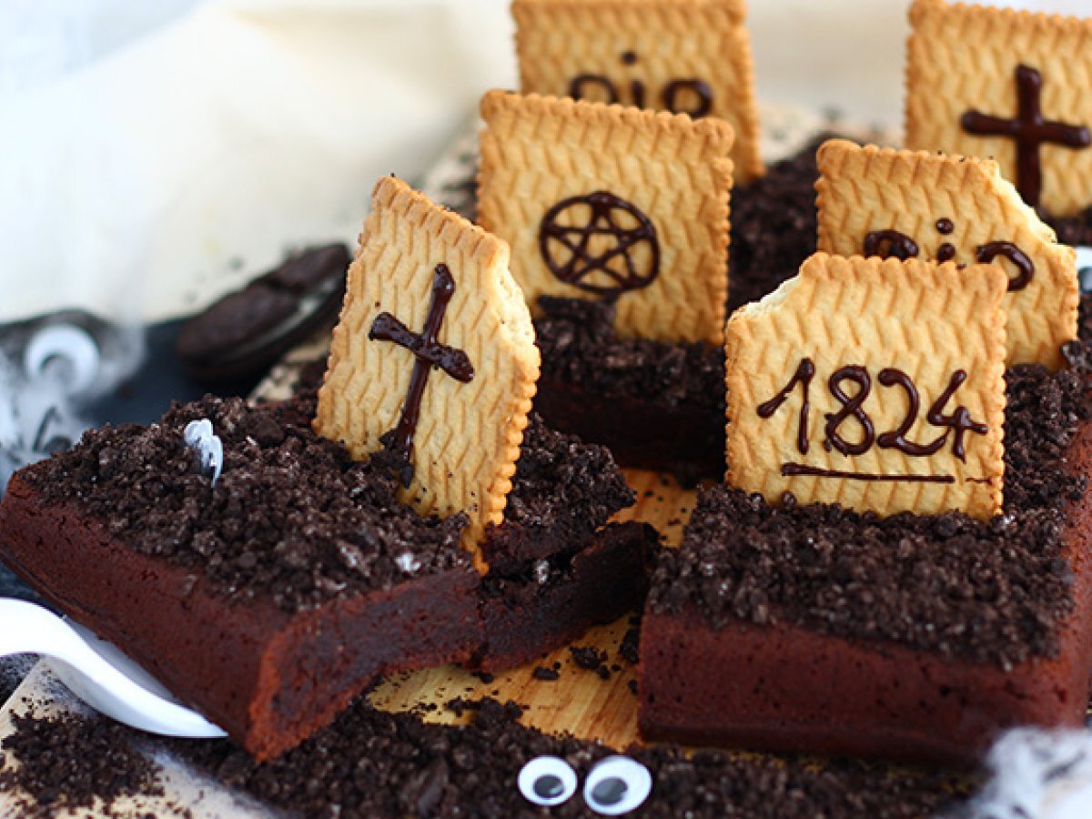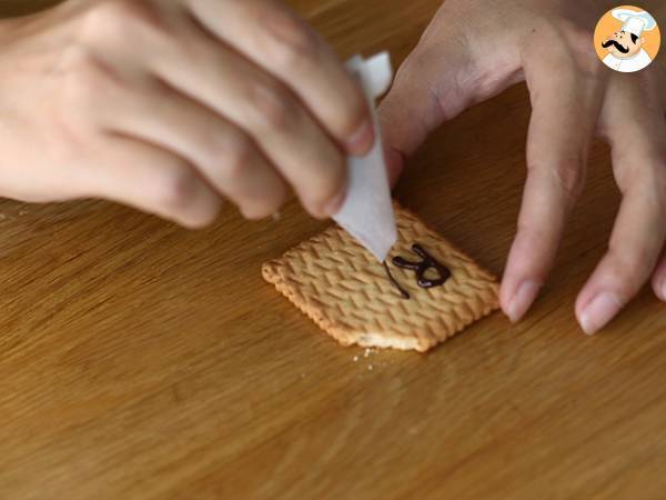 Se topesc 20 de grame de ciocolata si se umple cu ea un posh, un con sau o seringa de patiserie. Scriet pe biscuitii mici textele standard "RIP" sau desenati o cruce.Puteti rupe un colt pentru a da un efect de "patinat".