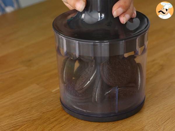 Taiati sau tocati biscutii Oreo pentru a face o pulbere de pamant si presarati-i peste negresa.