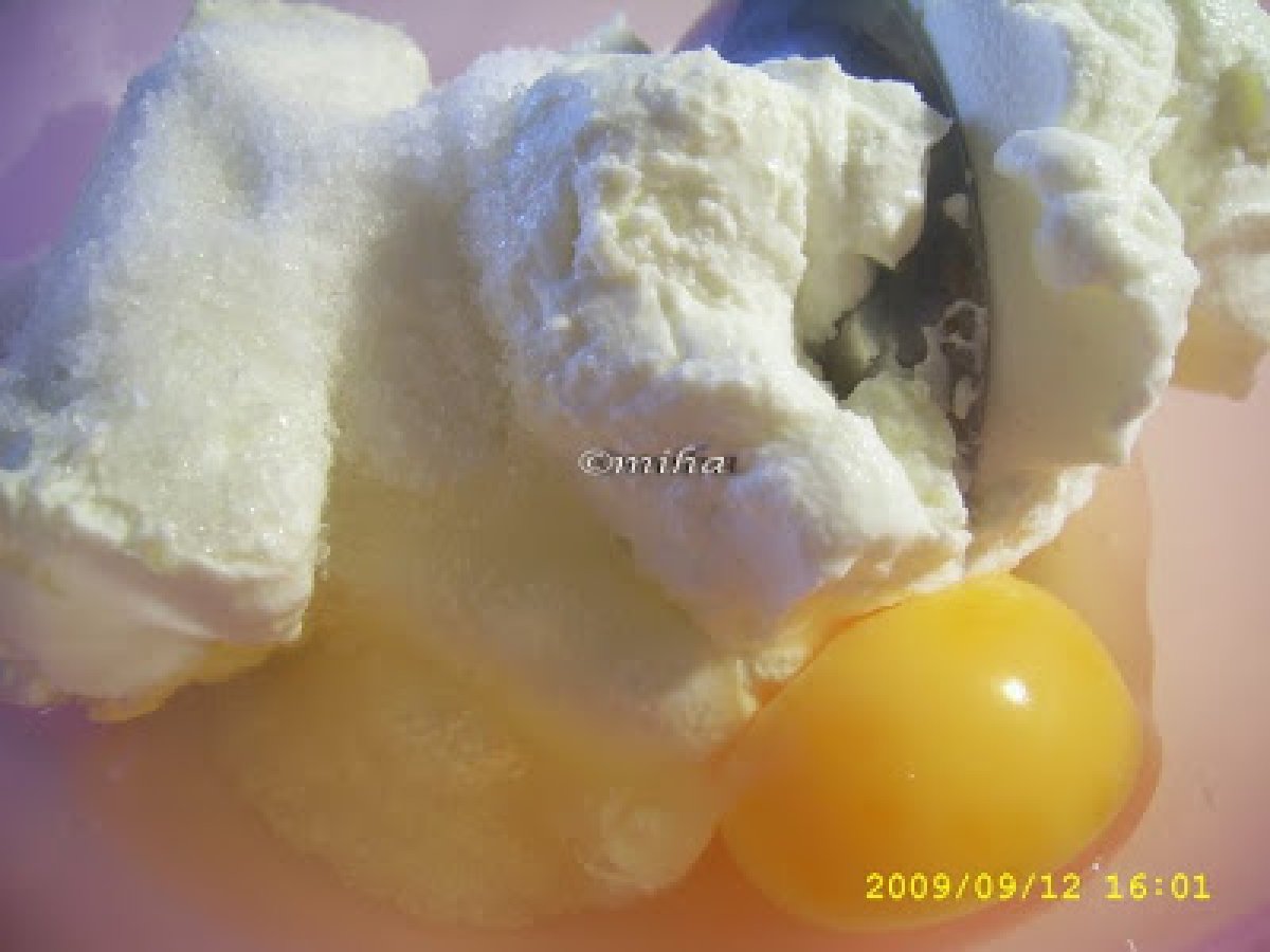 - Intr-un castron punem branza impreuna cu zaharul,oul si esenta de vanilie.Amestecam pana vom obtine o pasta omogena.