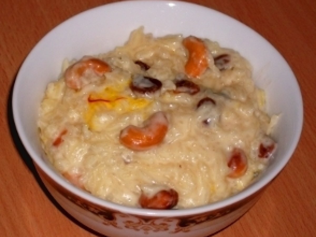 Paramannam (orez cu lapte, stafide si caju) DesertUșor Trimite unui prieten Printează pagina Adresează o întrebare autorului Postează o poză cu rețeta gătită de tine Ingrediente 4 1 cana orez Basmati 2 cani apa 3 cani lapte 1 mana stafide 1 mana caju crud 10 fire de sofran 4 linguri zahar 1 lingura ghee intarit (sau 2-3 linguri ghee topit) 1 lingurita cardamon pulbere