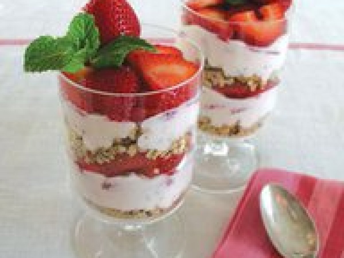 Parfait de capsuni (strawberry parfait) DesertFoarte ușor5 min Trimite unui prieten Printează pagina Adresează o întrebare autorului Postează o poză cu rețeta gătită de tine Ingrediente 2 iaurt integral (sau low fat) capsuni taiate feliute granola frisca zahar