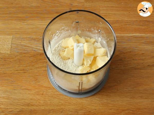 Puneti intr-un mixer faina + zaharul + sarea si amestecati. Adaugati untul taiat in bucati. Amestecati de 4 sau 5 ori pana cand untul se sfarama.