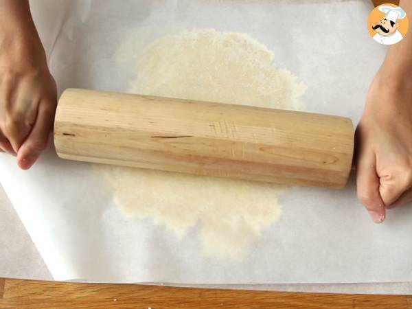 Transferați aluatul pe o hartie pergament si asezati o alta hartie pergament deasupra. Apasati cu un sucitor si dati-l la frigider timp de cel puțin 1 ora.