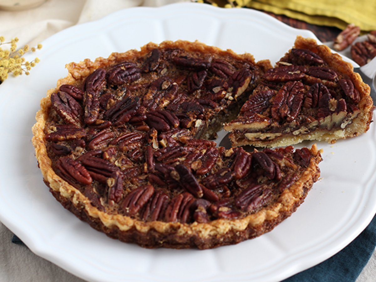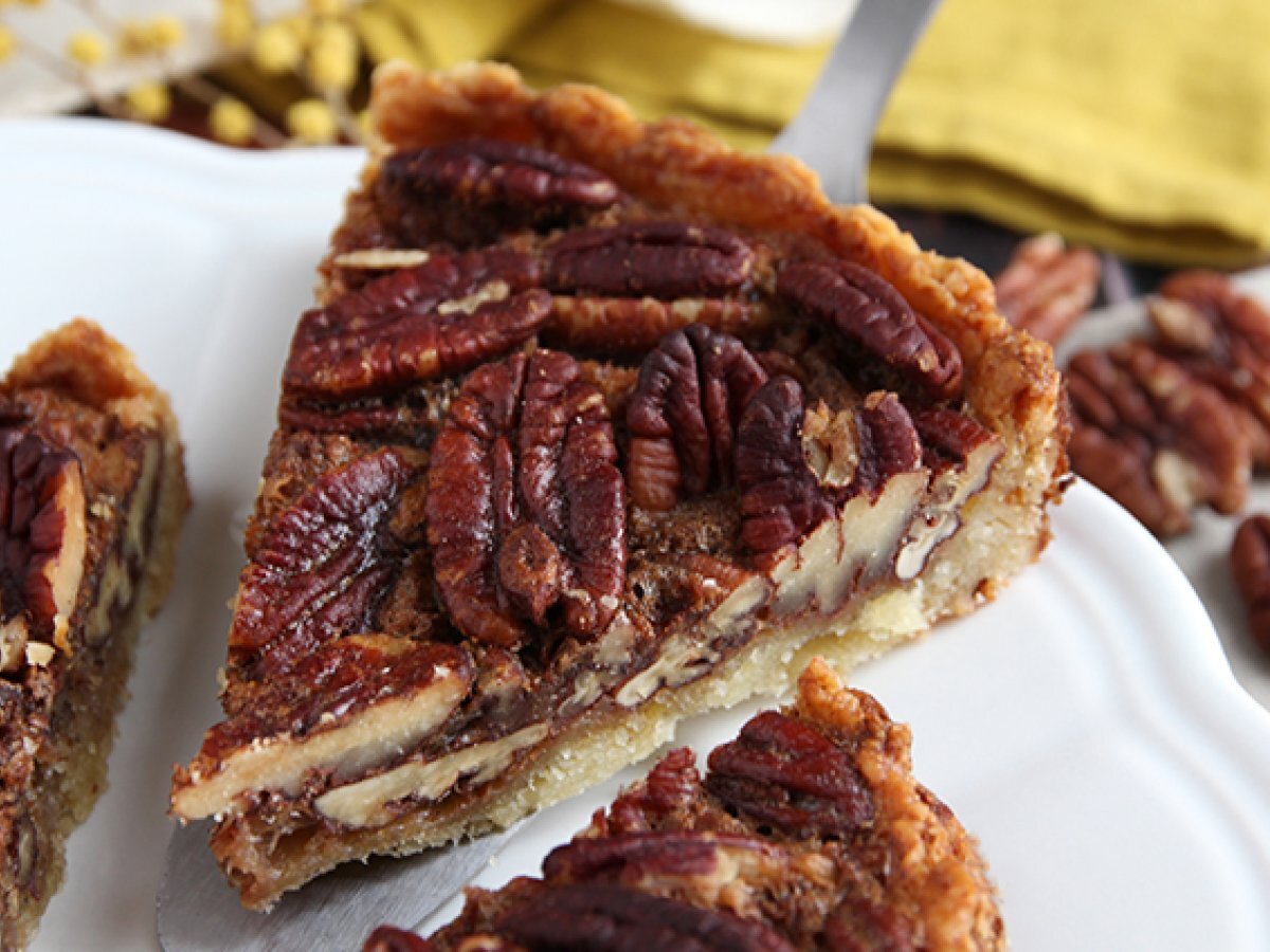 Aranjati nucile pecan pe toata suprafata aluatului si turnati umplutura deasupra. Coaceti timp 35 de minute la 180° C.