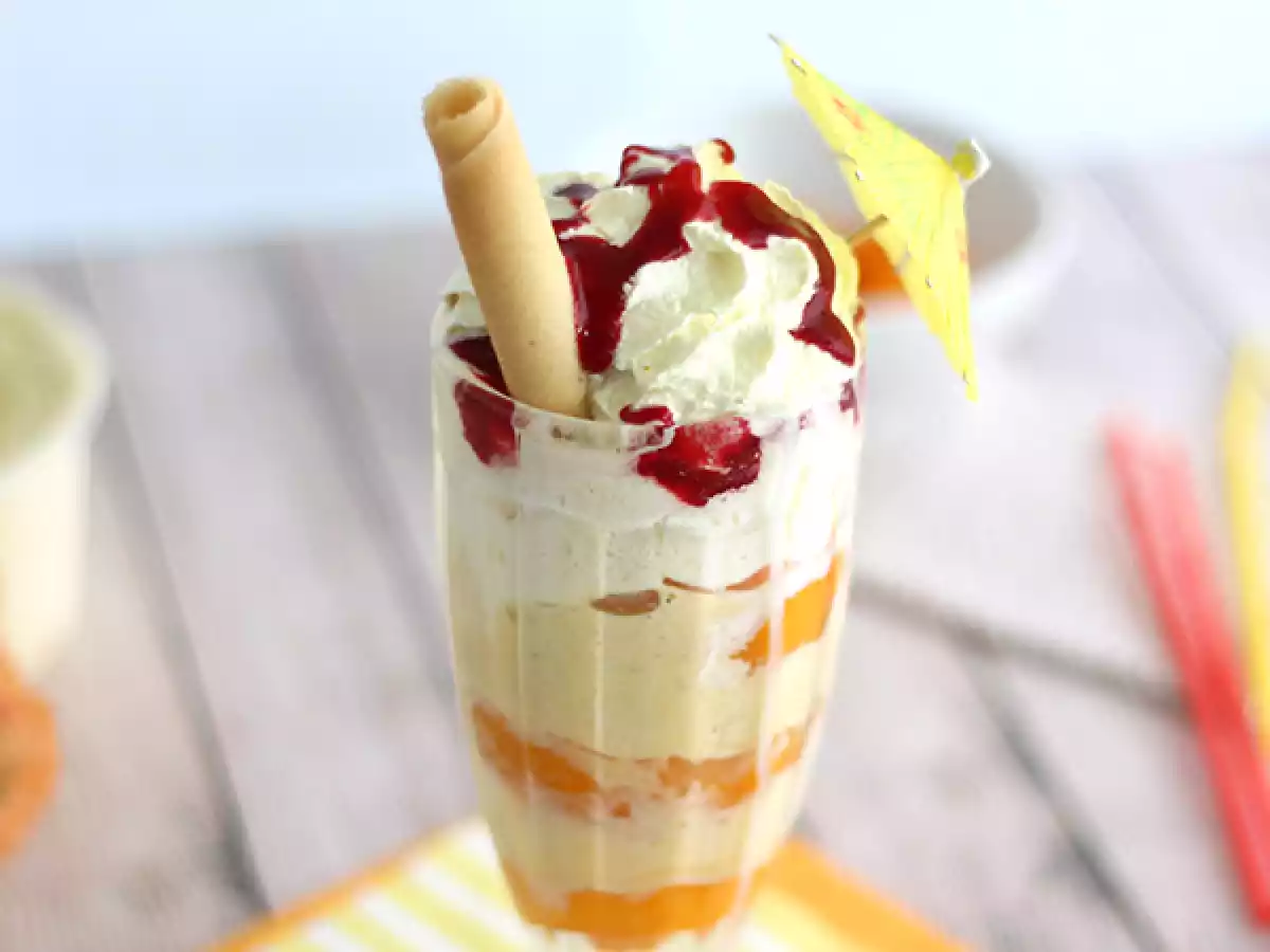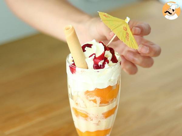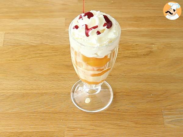 Ingredientele principale sunt 3 jumatati de piersici în sirop, 3 cupe de înghețată de vanilie, cremă Chantilly și coulis de zmeură.
