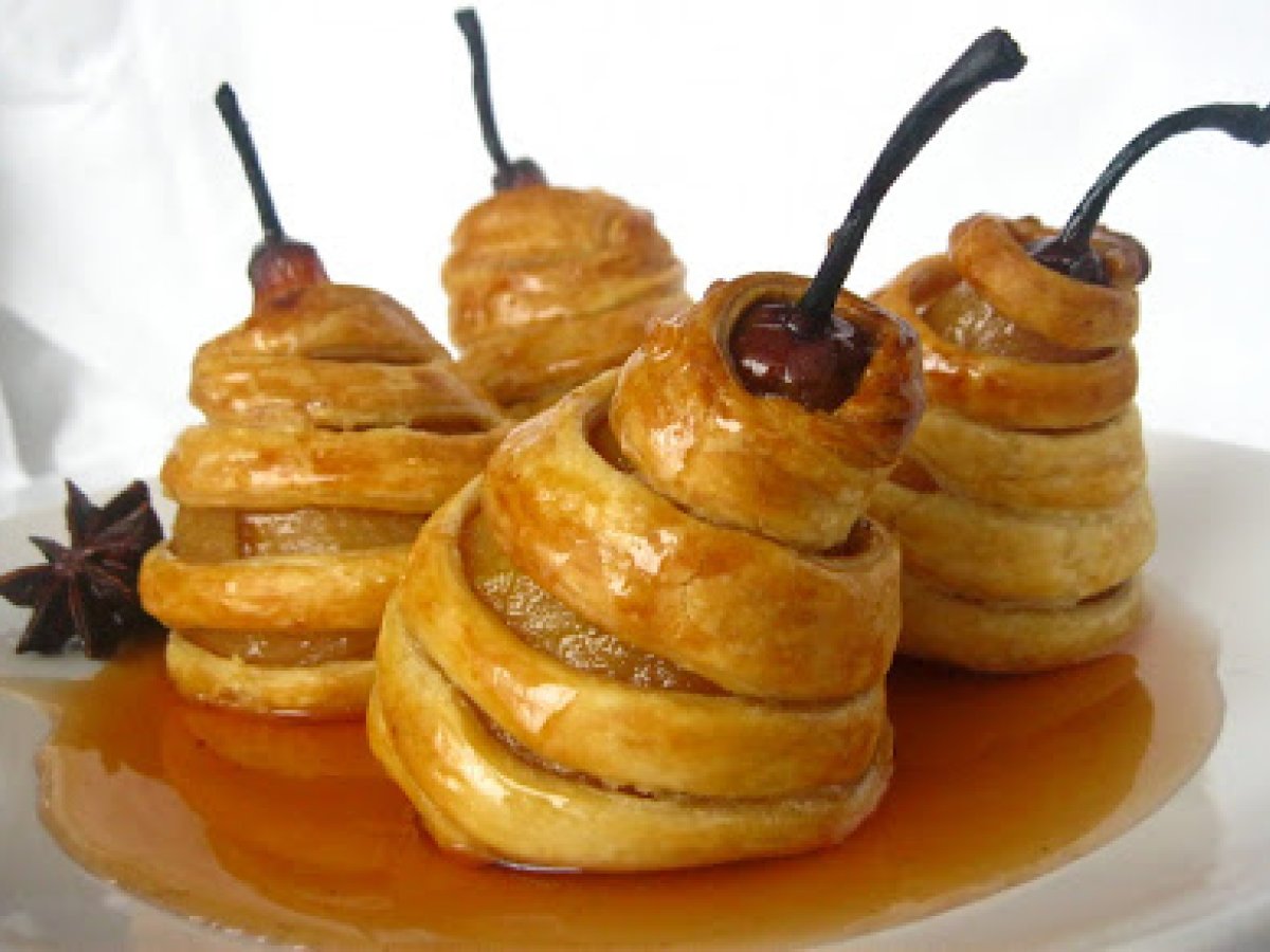 Pere in aluat de foietaj PrecedentulUrmătorul DesertFoarte ușor35 min Trimite unui prieten Printează pagina Adresează o întrebare autorului Postează o poză cu rețeta gătită de tine Ingrediente 6 1L apa 1.5 cups zahar 0.5 cup miere arome dupa gust: scortisoara, cuisoare, anason s-telat etc suc de la o jumatate de lamaie 200g aluat foietat gata preparat taiat fasii de 8mm latime