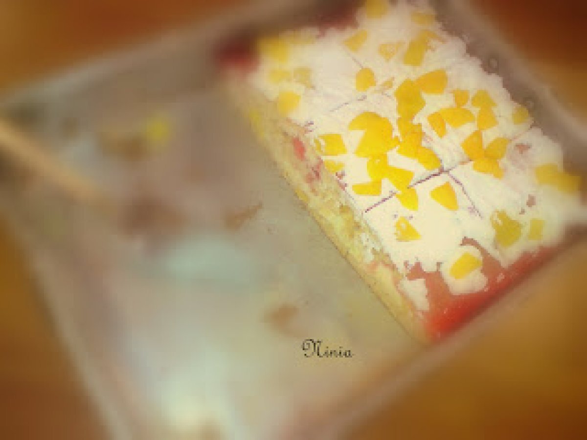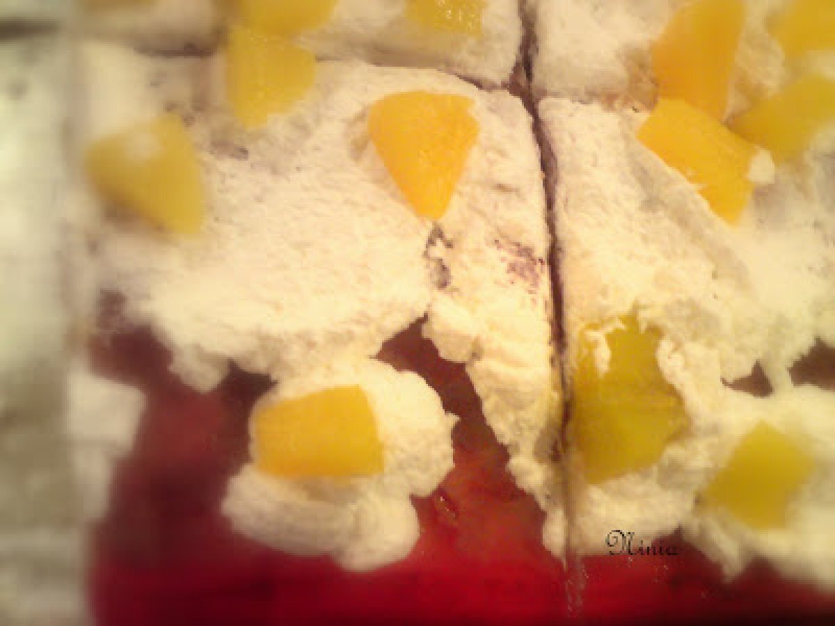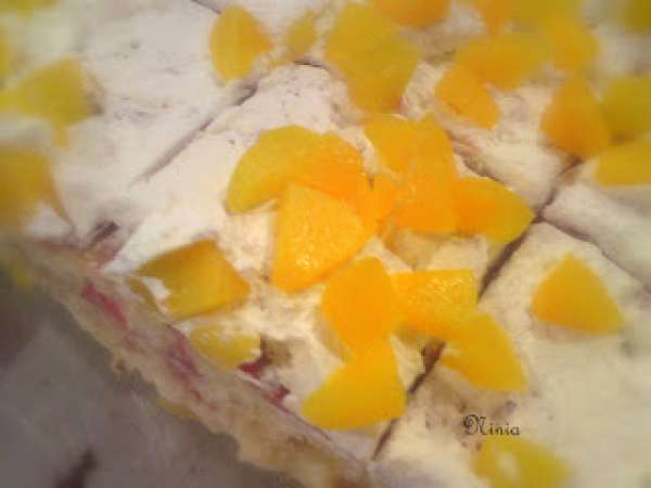 Prajitura cu budinca de vanilie si caise PrecedentulUrmătorul DesertFoarte ușor1 oră Trimite unui prieten Printează pagina Adresează o întrebare autorului Postează o poză cu rețeta gătită de tine Ingrediente 4 400 g zahar 3 oua 75 g unt 3 linguri miere 225 ml lapte 1 lingurita amoniac 450 g faina 2 plicuri budinca vanilie 800 ml lapte piersici cubulete dintr-un compot 2 pliculete gelatina alba 200 ml apa 2 pliculete gelatina roz 500 ml apa frisca hulala
