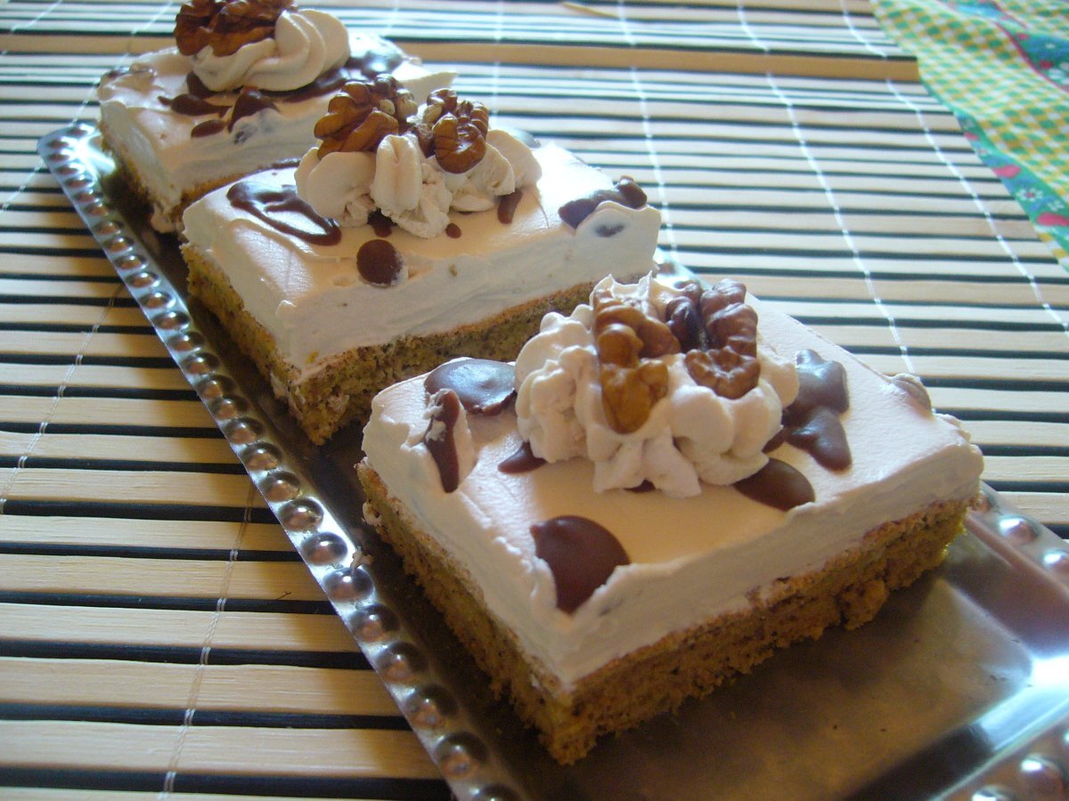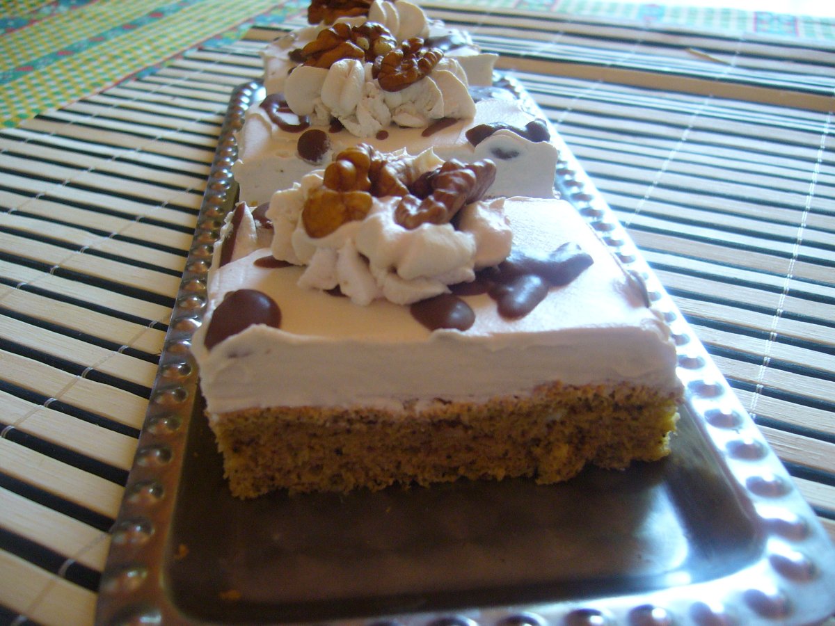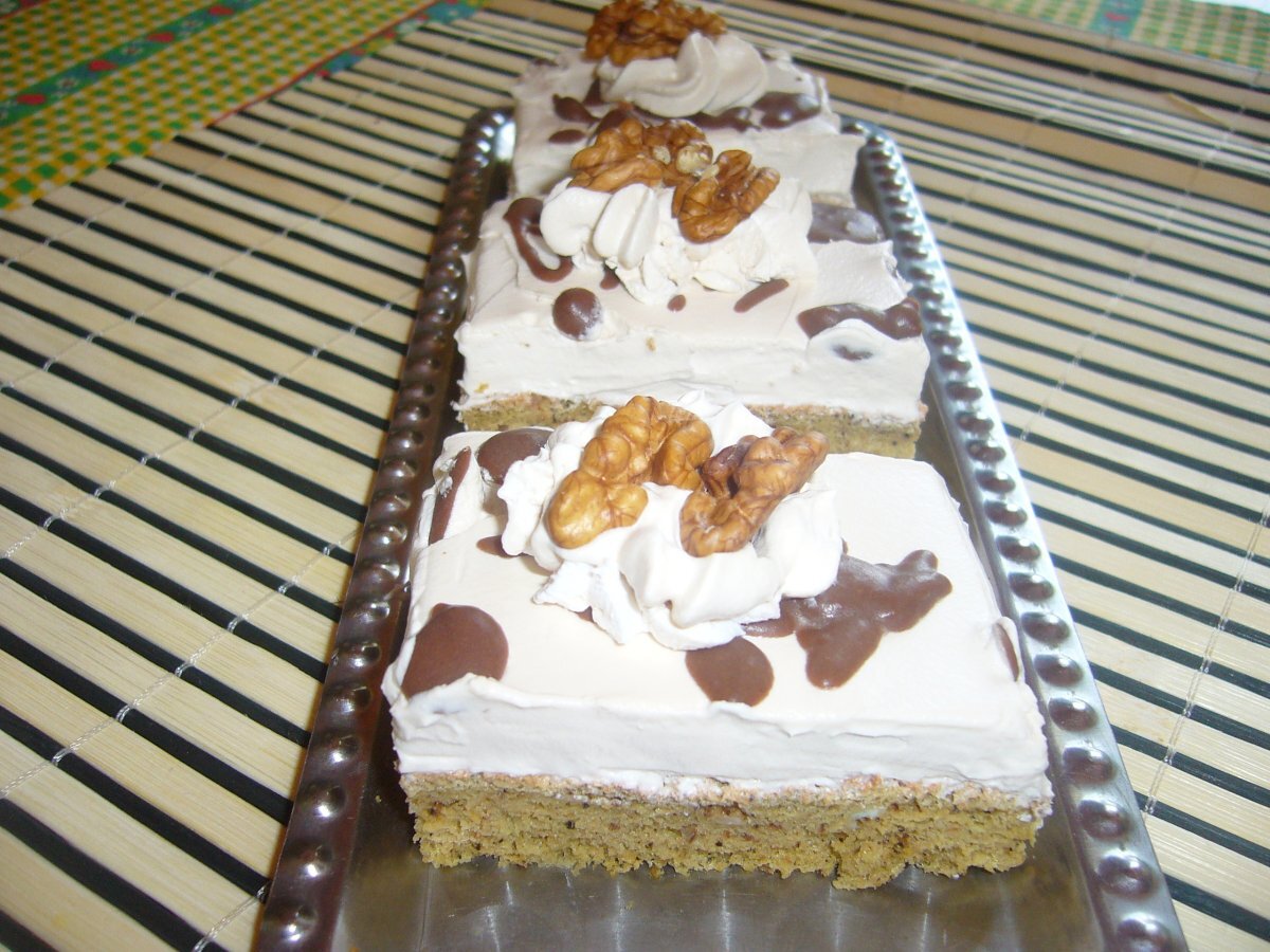 Prajitura cu cafea si nuca PrecedentulUrmătorul DesertFoarte ușor1 h 30 m Trimite unui prieten Printează pagina Adresează o întrebare autorului Postează o poză cu rețeta gătită de tine Ingrediente 8 Blat: 5 oua, 5 lg apa, 5 lg cu varf de zahar, 1 praf de copt, 1 lingurita de cafea naturala, 2 lg cu varf de nuca, 5 lg de faina Crema: 500 ml frisca, 1 nesscafe 3:1 Decor: 50 gr ciocolata menaj, jumatati de nuca