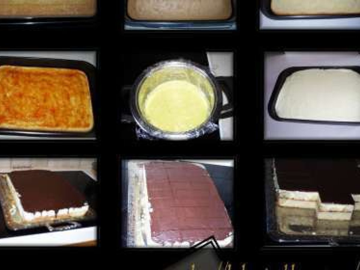 Prajitura cu crema de vanilie si banane PrecedentulUrmătorul DesertUșor2 ore Trimite unui prieten Printează pagina Adresează o întrebare autorului Postează o poză cu rețeta gătită de tine Ingrediente 8 INGREDIENTE BLAT 5 oua 200g zahar 200g faina 1/8l ulei 1/8l apa 1 pac zahar vaniliat 1 lamiie-coaja 1 pac. praf de copt ~~~~~~~~~~~~~ 200ml lichid dupa dorinta pentru insiroparea blatului.Eu am pus lapte amestecat cu sirop de banane. INGREDIENTE CREMA: 250g unt 1 pac.praf de budinca de vanilie 500nl lapte 100g zahar pudra esenta de rom/vanilie 3 foi de gelatina. INGREDIENTE GLAZURA~UMPLUTURA: 100g marmelada de caise(facultativ) 200g ciocolata 100g unt 6-8 banane,depinde de marimea lor.