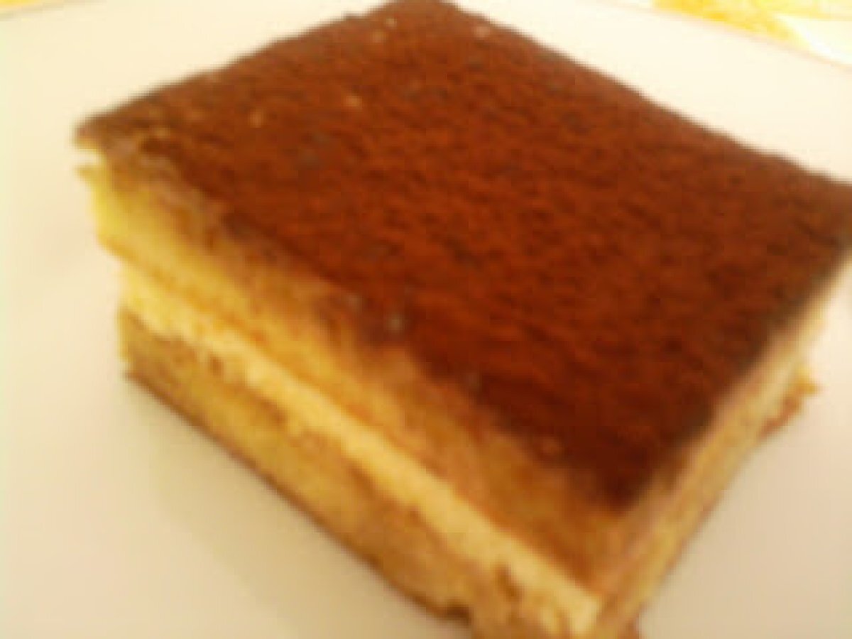 Prajitura cu crema tiramisu DesertFoarte ușor55 min Trimite unui prieten Printează pagina Adresează o întrebare autorului Postează o poză cu rețeta gătită de tine Ingrediente 6 4 oua 4 linguri de faina 4 linguri de zahar Pentru crema: 300 g mascarpone 300 ml smantana dulce Pentru sirop: 250 ml cafea esenta de rom Pentru decor cacao