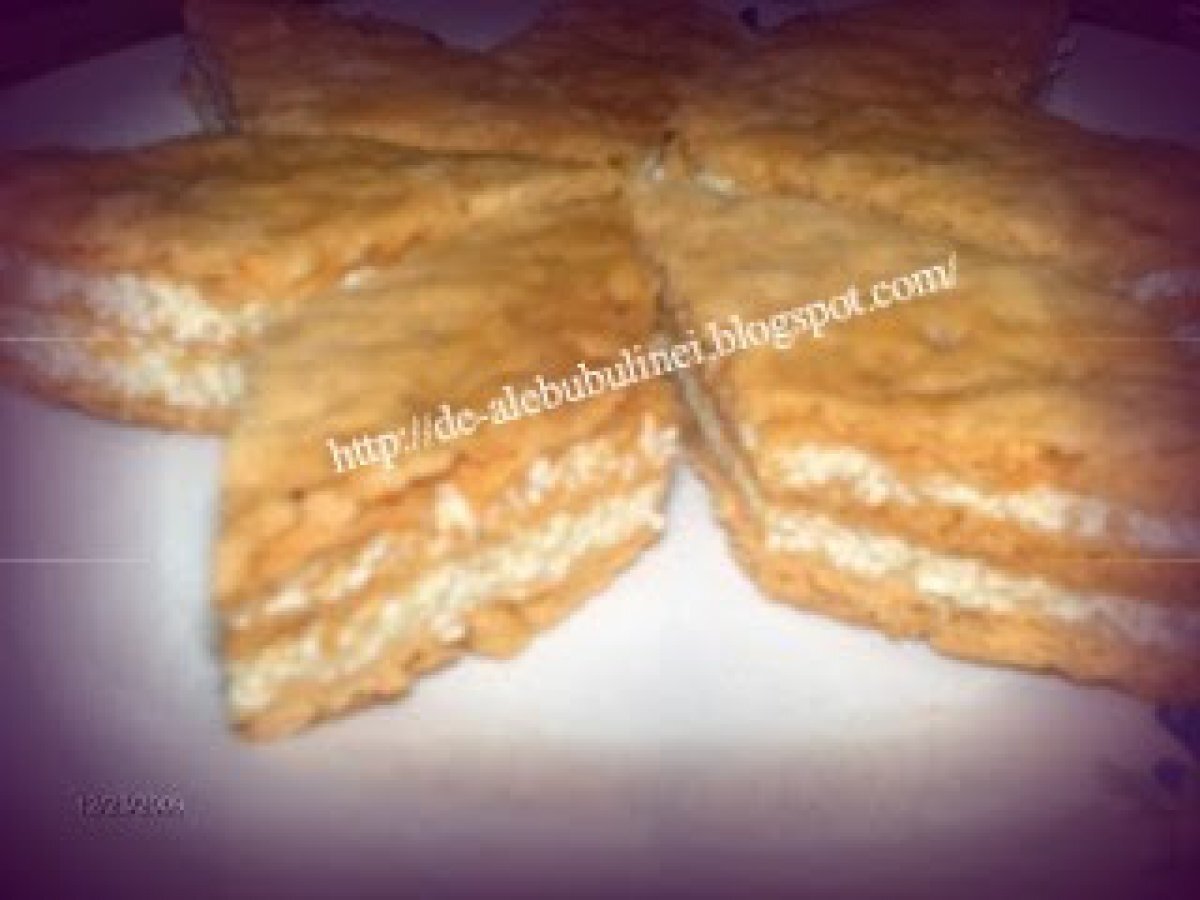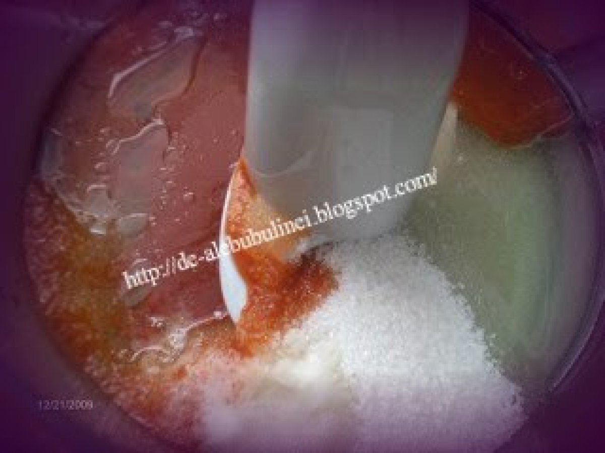 Prajitura cu foi din suc de rosii PrecedentulUrmătorul DesertFoarte ușor40 min Trimite unui prieten Printează pagina Adresează o întrebare autorului Postează o poză cu rețeta gătită de tine Ingrediente 4 11 linguri zahar 11 linguri ulei 11 linguri suc de rosii 1 lingurita bicarbonat stins cu lamaie, faina cat cuprinde. Crema: 1 pachet margarina Rama 1 cana zahar pudra 4 linguri gris apa vanilie zeama de lamaie