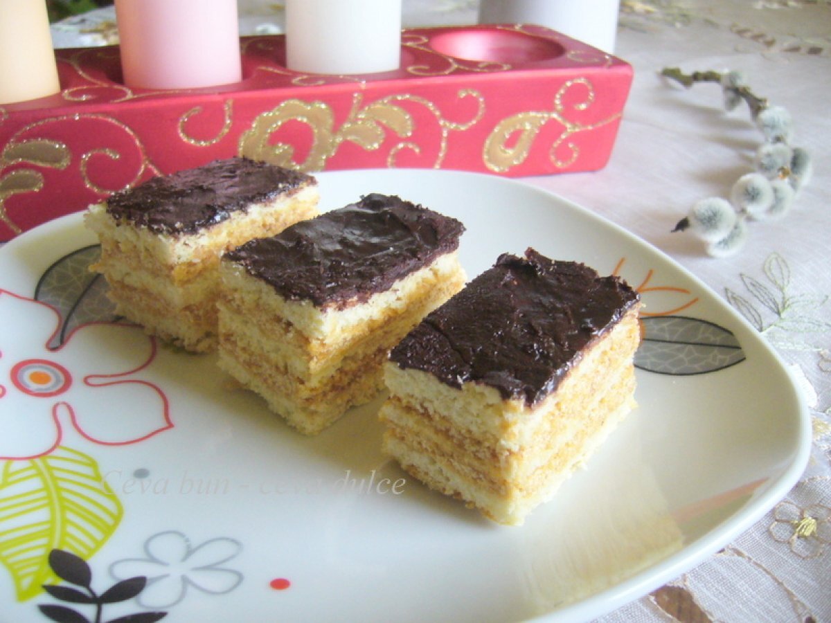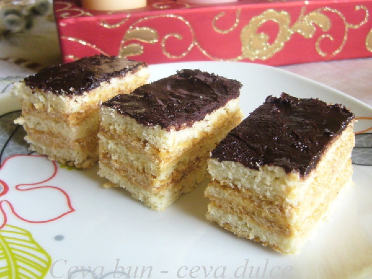Prajitura cu foi si crema caramel PrecedentulUrmătorul DesertUșor1 h 10 m Trimite unui prieten Printează pagina Adresează o întrebare autorului Postează o poză cu rețeta gătită de tine Ingrediente 8 Foi: 400 g faina 150 g zahar 2 oua 50 g unt topit 1 lingurita praf de copt 1/2 lingurita bicarbonat de sodiu 100 ml lapte Crema: 300 g zahar 100 g faina / amidon alimentar 300 ml lapte 3 plicuri zahar vanilat 200 g unt/ margarina Glazura: 100 g ciocolata menaj 2-3 liguri ulei
