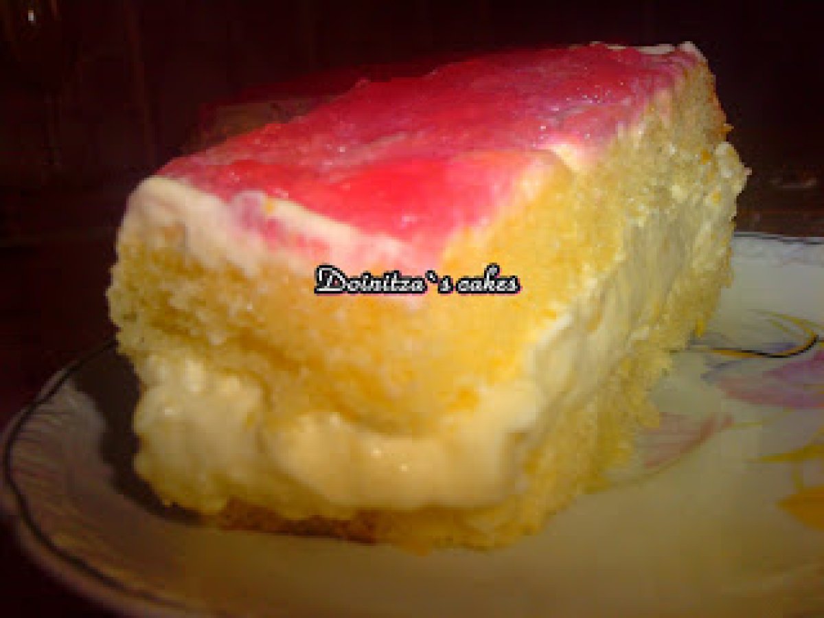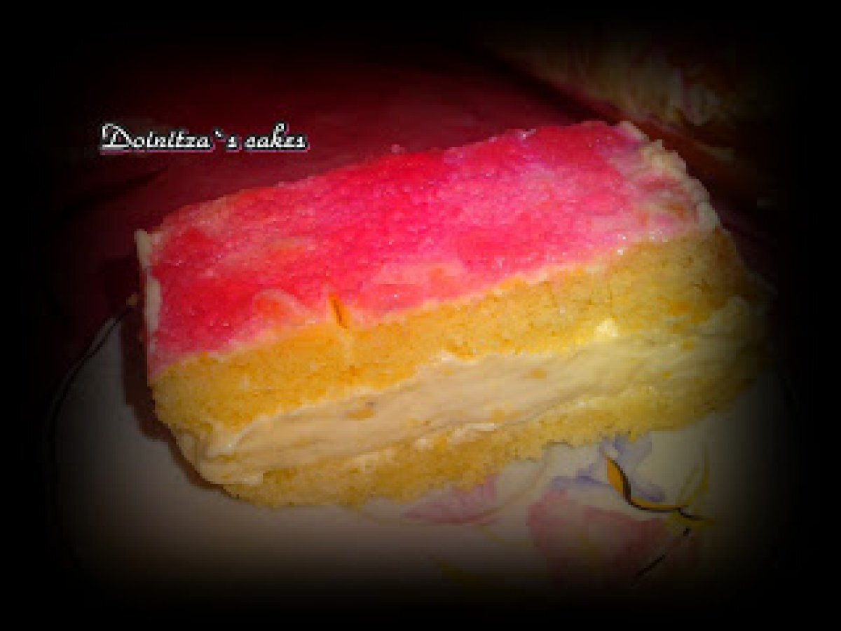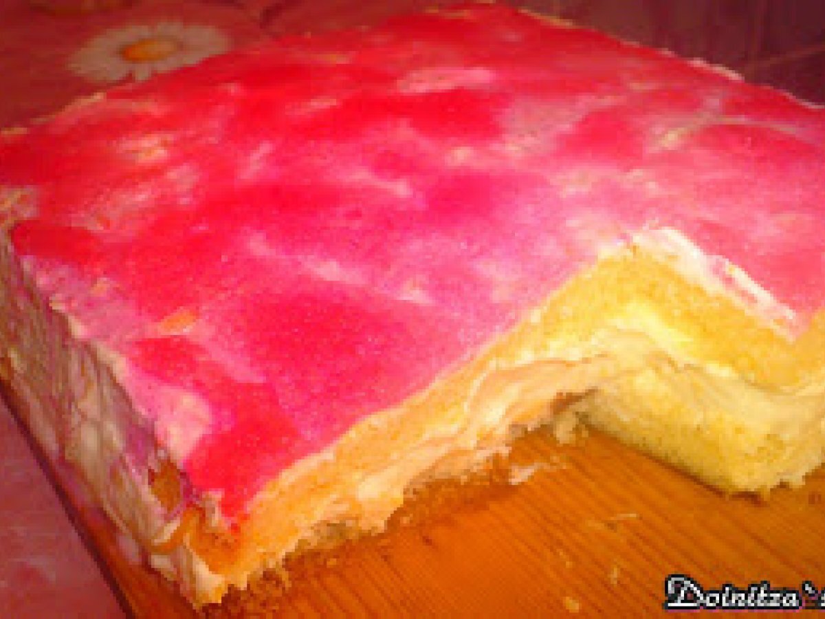 Prajitura cu gust de inghetata votează acum PrecedentulUrmătorul DesertFoarte ușor55 min Trimite unui prieten Printează pagina Adresează o întrebare autorului Postează o poză cu rețeta gătită de tine Ingrediente 8 blat din 7 oua insiropat cu esenta de vanilie si zahar, umplut cu crema de oua , budinca si frisca, ornat deasupra cu gelatina rosie CREMA DE OUA: 9 lg.de zahar, 2 oua, 1 budinca de vanilie. 3 lg.de faina, 1l de lapte 700 ml.de frisca