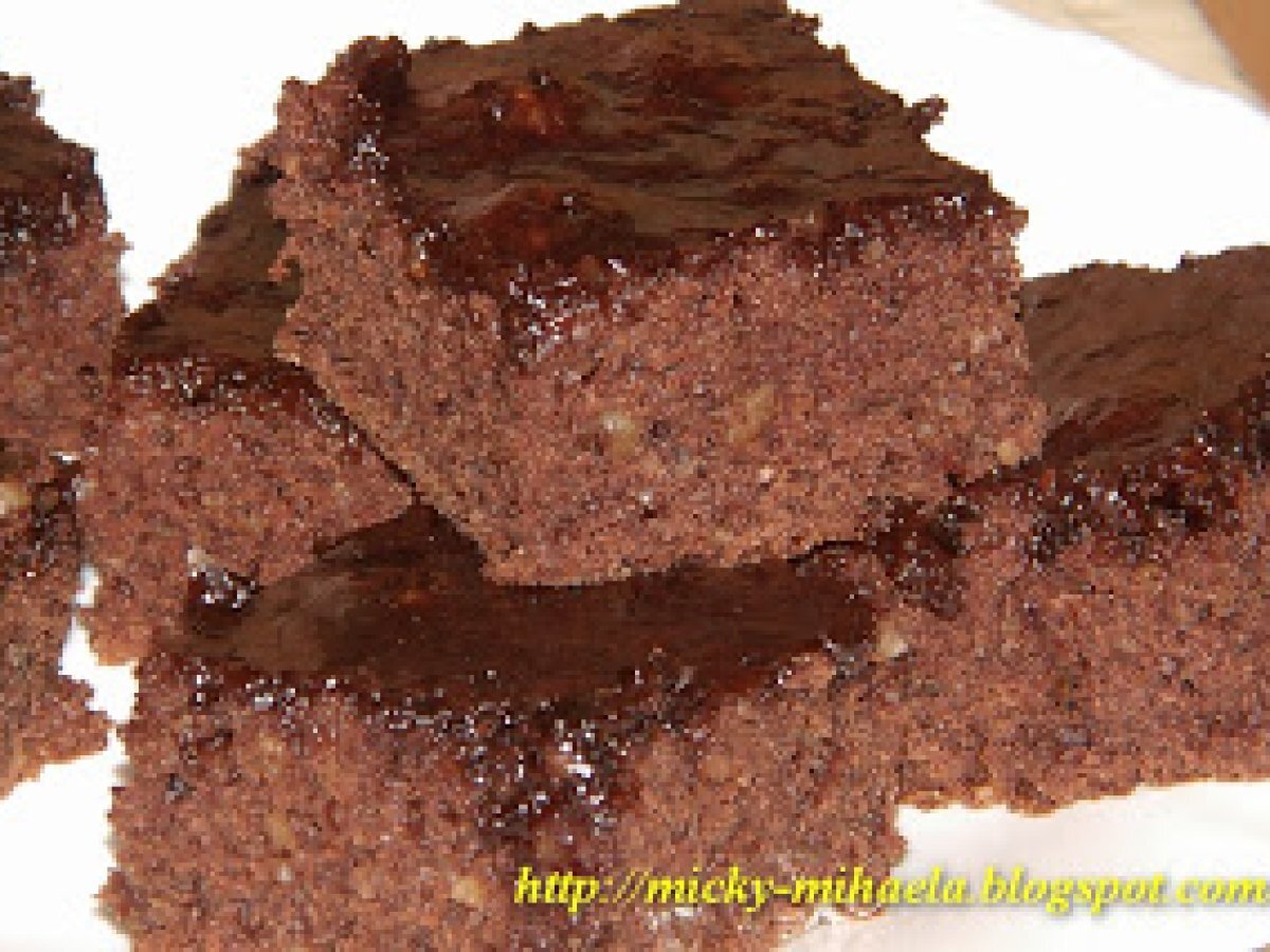 Prajitura cu nuca, gem si cacao - de post DesertFoarte ușor50 min Trimite unui prieten Printează pagina Adresează o întrebare autorului Postează o poză cu rețeta gătită de tine Ingrediente 6 500 g faina, un praf de sare, 10 g praf de copt, 10 g bicarbonat, 5 linguri cacao, 300 g zahar, 50 ml ulei, 400 ml apa, 5 linguri cu gem de caise, 300 g nuci. Glazura: 50 ml apa, 100 g zahar, 3 linguri cacao.