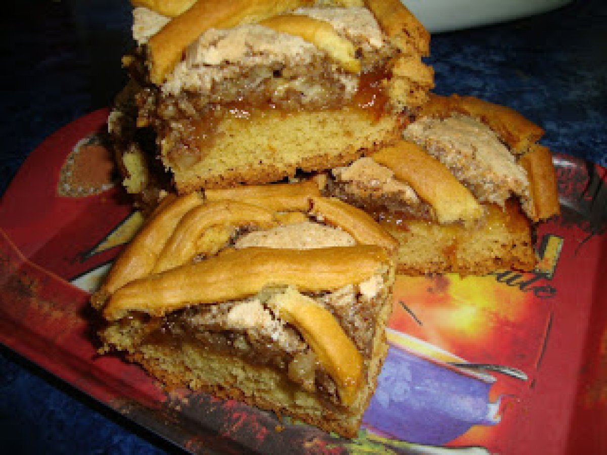 Prajitura cu nuca si gem de caise PrecedentulUrmătorul DesertFoarte ușor50 min Trimite unui prieten Printează pagina Adresează o întrebare autorului Postează o poză cu rețeta gătită de tine Ingrediente 6 Pentru aluat: 3 linguri margarina 3 linguri smantana 3 linguri zahar 1 lingurita praf de copt 1/2 lingurita bicarbonat de sodiu alimentar 4-5 linguri de lapte 3 galbenusuri de ou 500 g faina Pentru umplutura: 3 albusuri de ou un varf de cutit de sare 10 linguri de zahar o cana de nuca 2/3 dintr-un borcan cu gem de caise coaja de la o lamaie