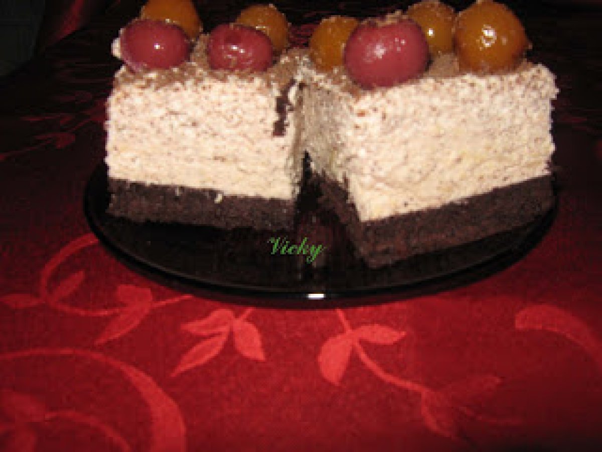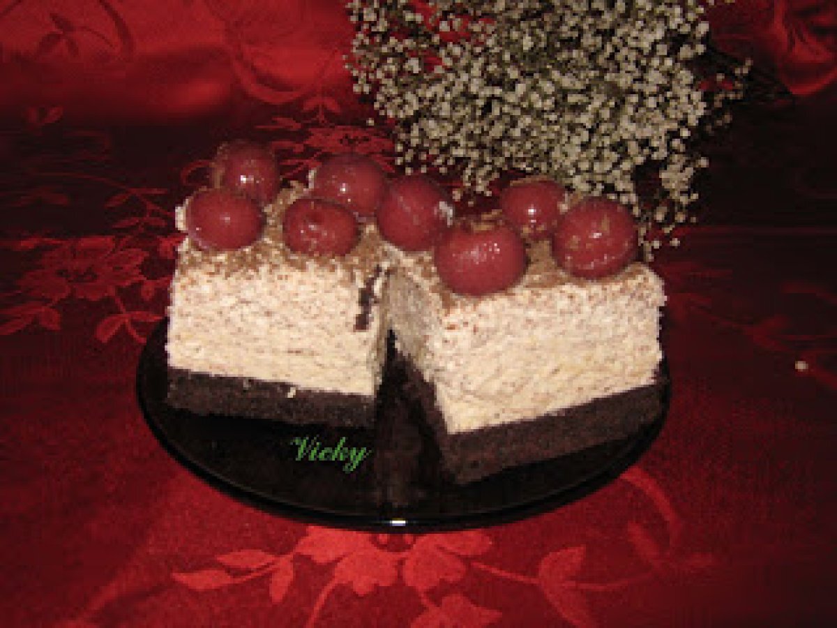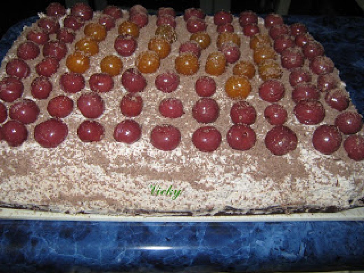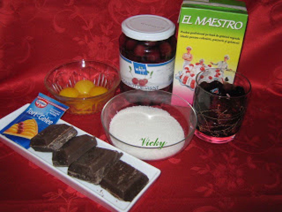 Prajitura cu rom si visine PrecedentulUrmătorul DesertFoarte ușor1 h 50 m Trimite unui prieten Printează pagina Adresează o întrebare autorului Postează o poză cu rețeta gătită de tine Ingrediente 5 4 oua 120 g zahar tos 4 linguri apa fierbinte 130 g faina 30 g cacao 1 pliculet praf de copt Pentru crema:4 galbenusuri 400 ml frisca lichida 1 pliculet de gelatina 1 ciocolata cu lapte 100 g zahar 125 ml rom 1 borcan de compot de visine