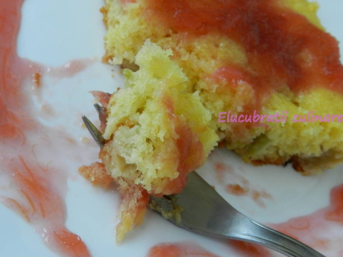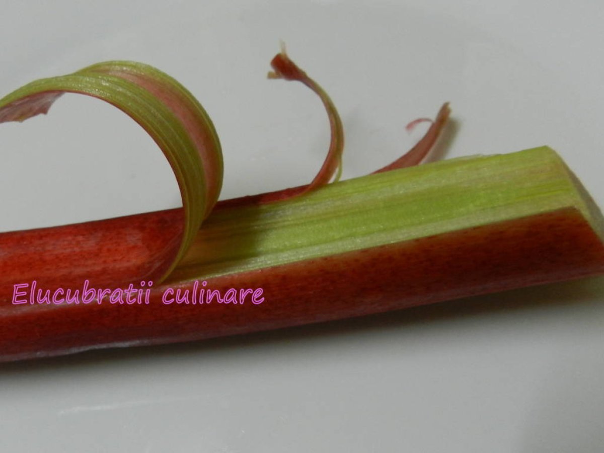 Prăjitură cu rubarbă PrecedentulUrmătorul DesertUșor40 min Trimite unui prieten Printează pagina Adresează o întrebare autorului Postează o poză cu rețeta gătită de tine Un desert special pentru aceste zile calduroase Ingrediente 8 5 tulpini rubarbă, 1 lingură zahăr, 1 pliculeț zahăr vanilat, 4 ouă, 100 g unt, 250 g zahăr, 50 ml lapte, 250 g făină, 10 g praf de copt, un praf de sare. Sos: 2 tulpini rubarbă, 1 cană apă, 1 cană zahăr.