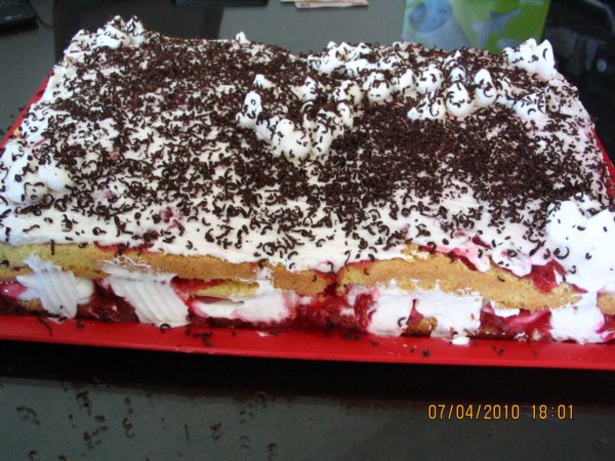 Prajitura cu visine si frisca DesertFoarte ușor2 h 35 m Trimite unui prieten Printează pagina Adresează o întrebare autorului Postează o poză cu rețeta gătită de tine Ingrediente 10 Blat: 6 oua, 150 g zahar, 150 g faina, 30 gr amidon, 2 linguritze praf copt, putina sare, 3 linguri apa fierbinte. Umplutura: 375 ml suc de visine, 160 g de zahar 3 linguri pline de amidon, 650 gr visine proaspete 1 plic zahar vanilat, 1 litru frisca lichida