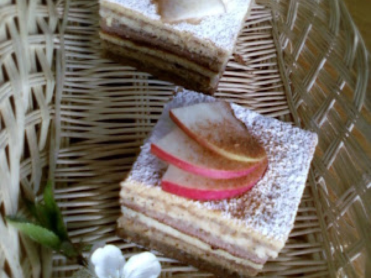 Prajitura napolitan cu mere votează acum DesertFoarte ușor50 min Trimite unui prieten Printează pagina Adresează o întrebare autorului Postează o poză cu rețeta gătită de tine Ingrediente 10 2 pahare cu apa 8 linguri de ulei 1 plic zahar vanilat, esenta de vanilie 100 g nuci maruntite foarte fin 6 linguri de miere 5 linguri de gem de prune 2 lingurite de cacao 1 lingura de bicarbonat dizolvat in 2 linguri de otet faina cat cuprinde 6 mere mari 1 lingurita cu varf de scortisoara zahar vanilat pt pudrat 1 mar pt decor