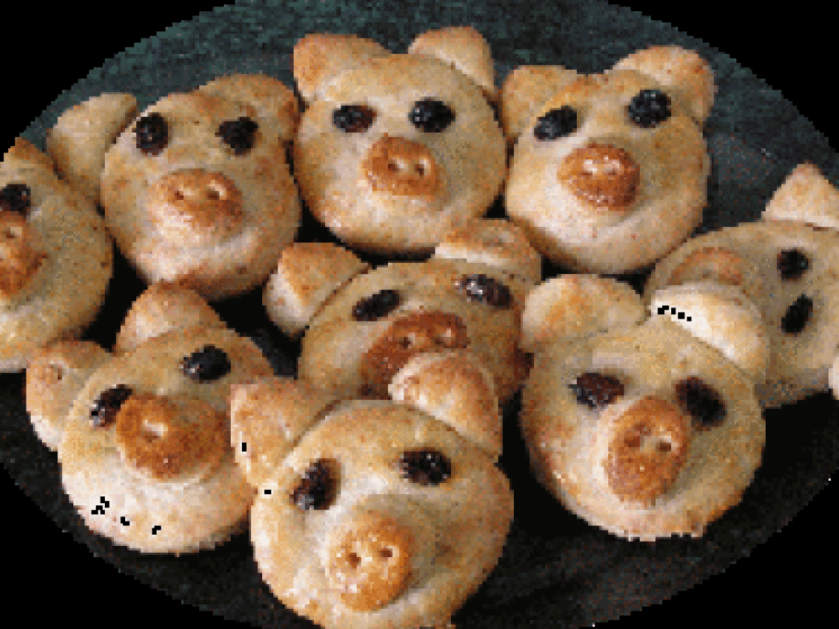 Pentru purcelusi cu decupatorul rotund mai mare se taie capul. Pentru urechi se decupeaza un cerc mai mic si se taie in doua. Pentru ochi se pot folosi stafide, iar pentru nas un cerc si mai mic, si se gaureste cu paie in doua locuri.