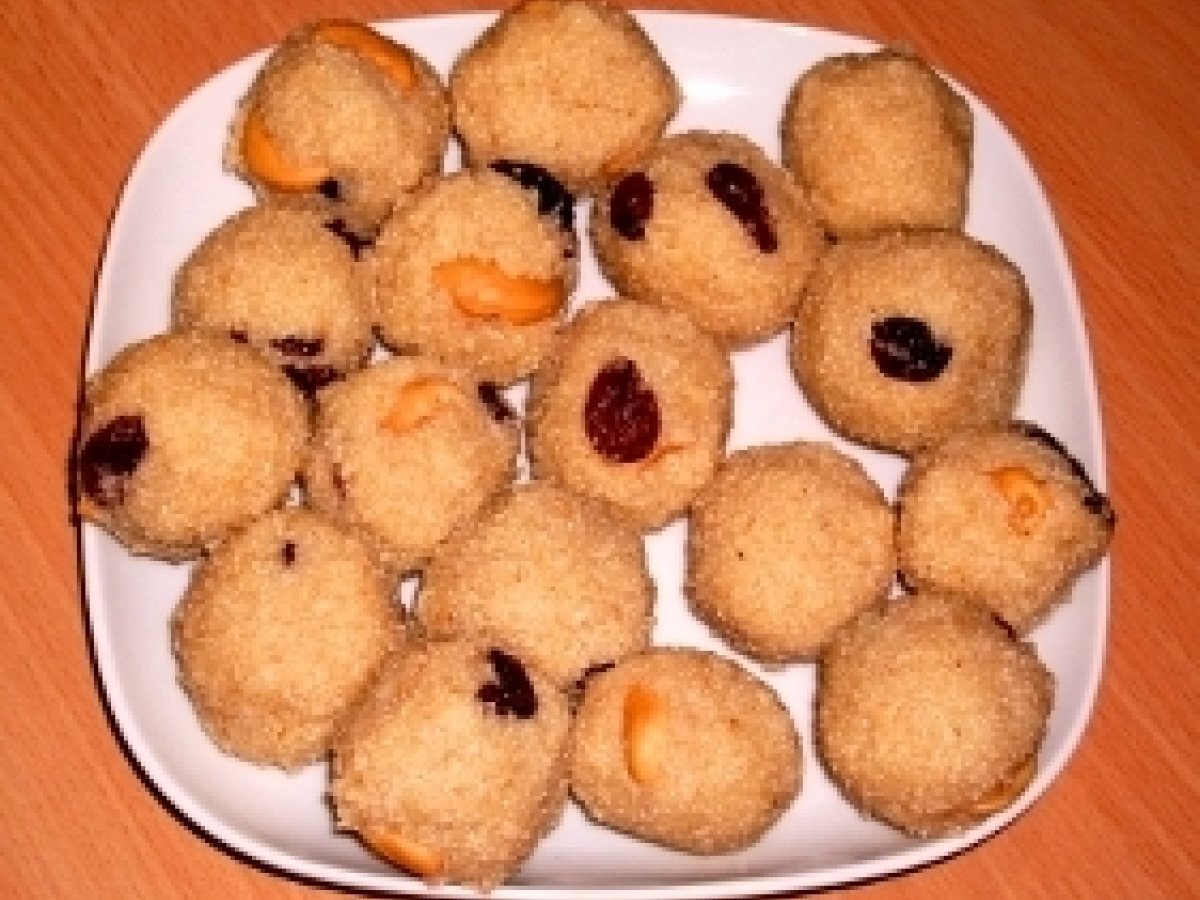 Rava ladoo (dulciuri indiene din gris) DesertUșor20 min Trimite unui prieten Printează pagina Adresează o întrebare autorului Postează o poză cu rețeta gătită de tine Ingrediente 8 1 cana Rava (gris) 2/3 cana zahar 2 linguri Ghee solidificat 5-6 linguri lapte caldut 1/2 lingurita cardamon pulbere 1 mana bucatele de nuca caju 20 stafide 2 linguri nuca de cocos