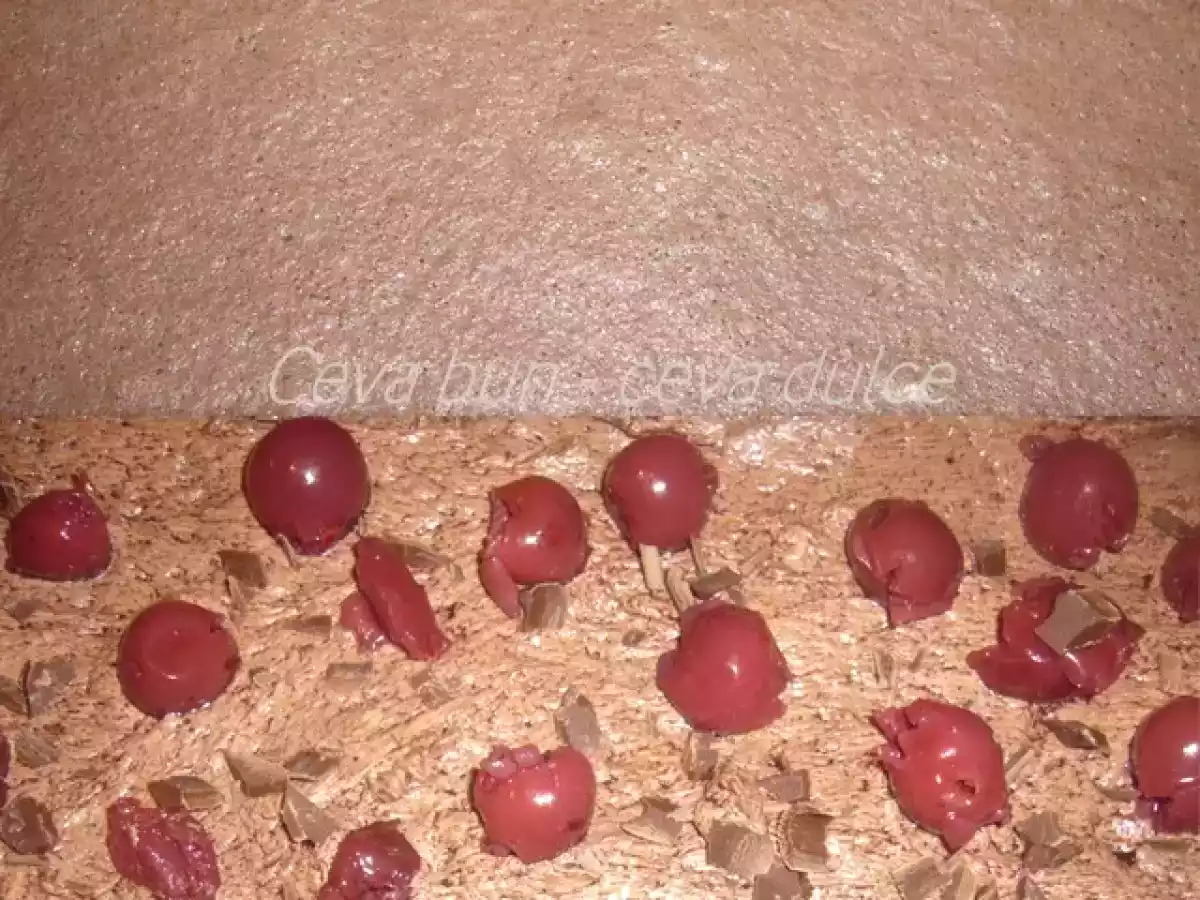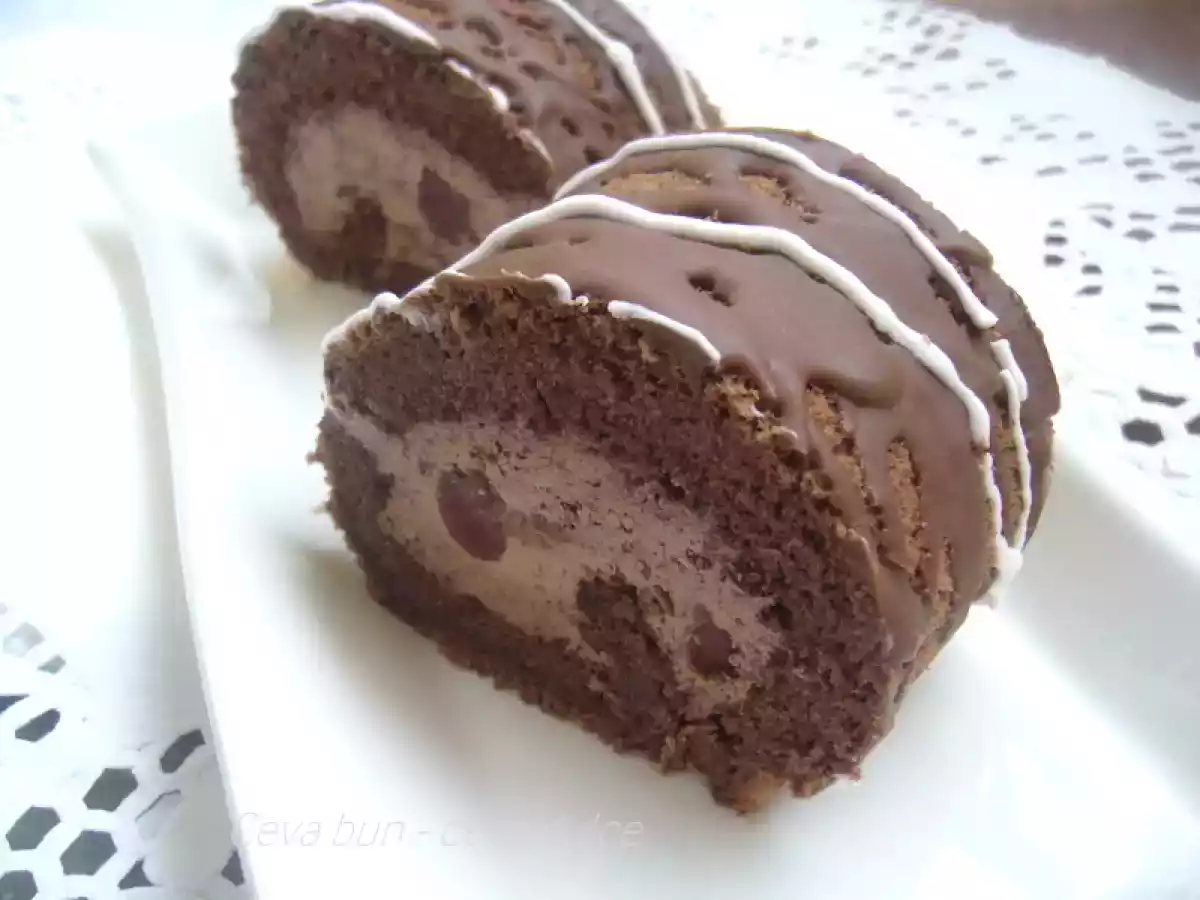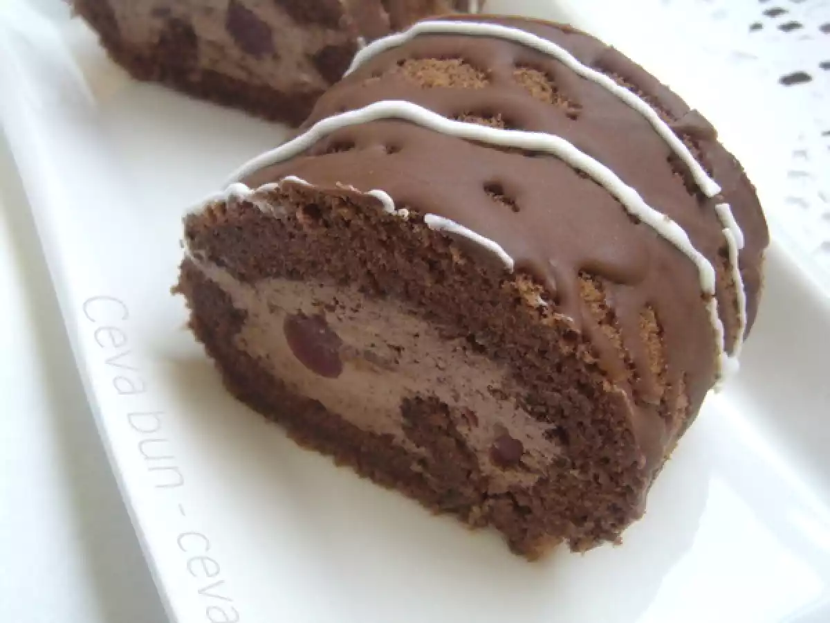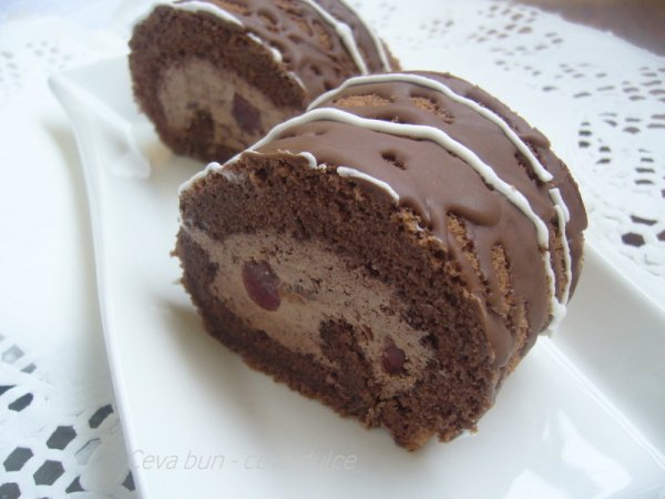 Rulada de ciocolata cu visine PrecedentulUrmătorul DesertFoarte ușor1 oră Trimite unui prieten Printează pagina Adresează o întrebare autorului Postează o poză cu rețeta gătită de tine . Ingrediente 6 Blat: 4 oua 4 linguri de faina ( 150 g ) 8 linguri de zahar ( 200 g ) 20 g cacao 30 g unt topit Crema: 2 oua intregi 200 g zahar 200 g unt 20 g cacao 100 g ciocolata amaruie ( 45% cacao) 200 g visine ( din compot) 50 g ciocolata rasa 50 ml frisca Glazura: 100 gr ciocolata 30 g unt 50 g ciocolata alba