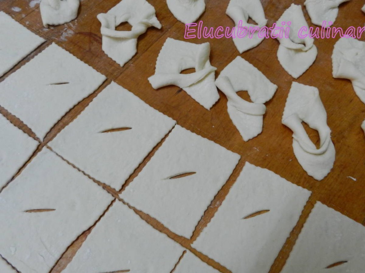 Se întinde aluatul foarte subțire, se taie în pătrățele (sau dreptunghiuri- cu cât forma e mai neregulată e mai gustoasă :)).