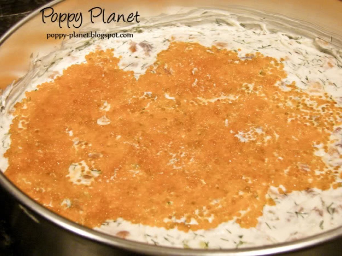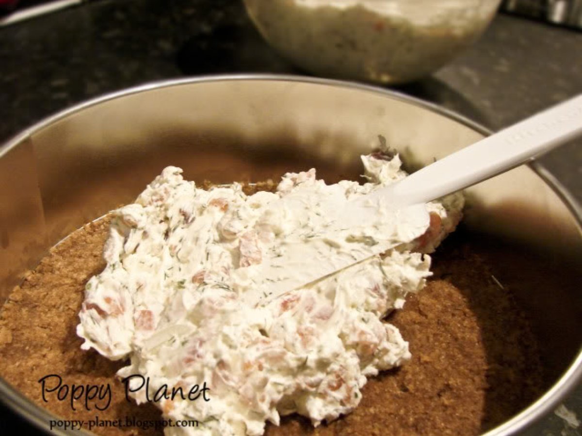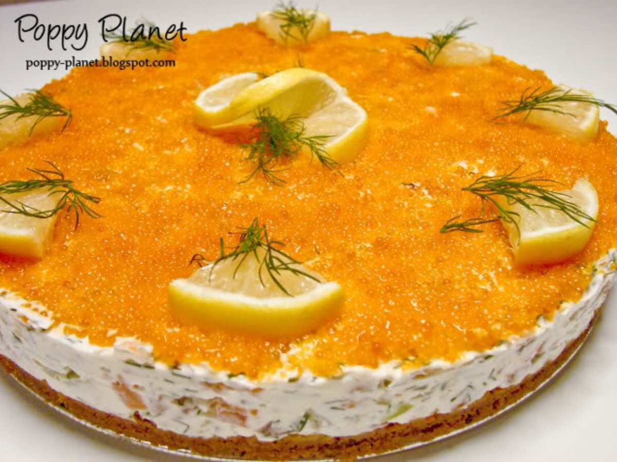 Smörgåstårtor - cheesecake cu somon PrecedentulUrmătorul DesertFoarte ușor50 min Trimite unui prieten Printează pagina Adresează o întrebare autorului Postează o poză cu rețeta gătită de tine Ingrediente 4 pentru blat: 300 g miez de paine neagra si 75 g unt pentru crema: - 400 g branza Philadelphia 200 g smantana 250 g somon afumat 2 cepe potrivite marar tocat pentru ornat: - 150 g icre caviar rosii felii de lamai, marar