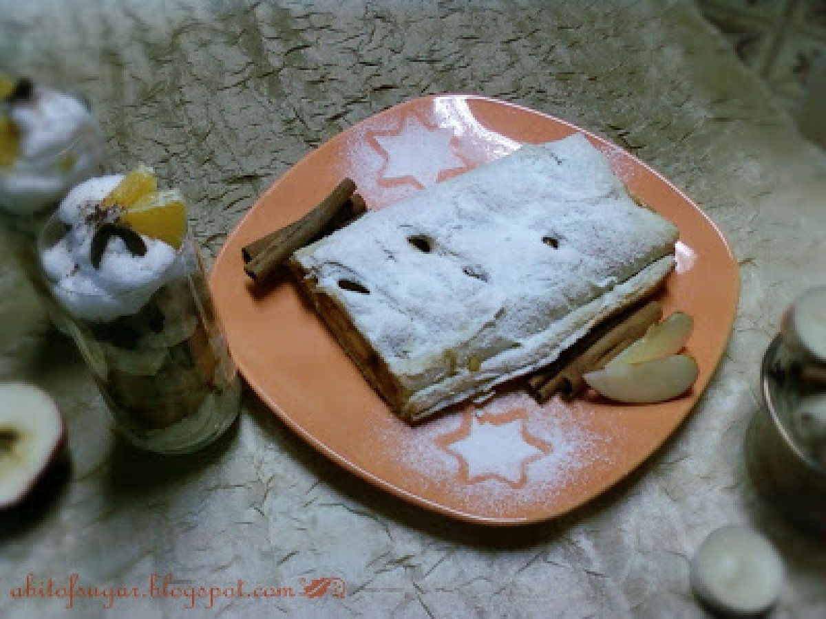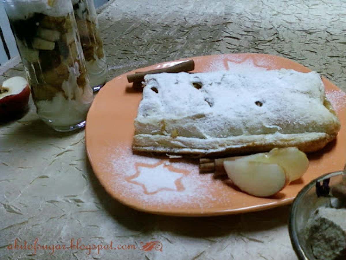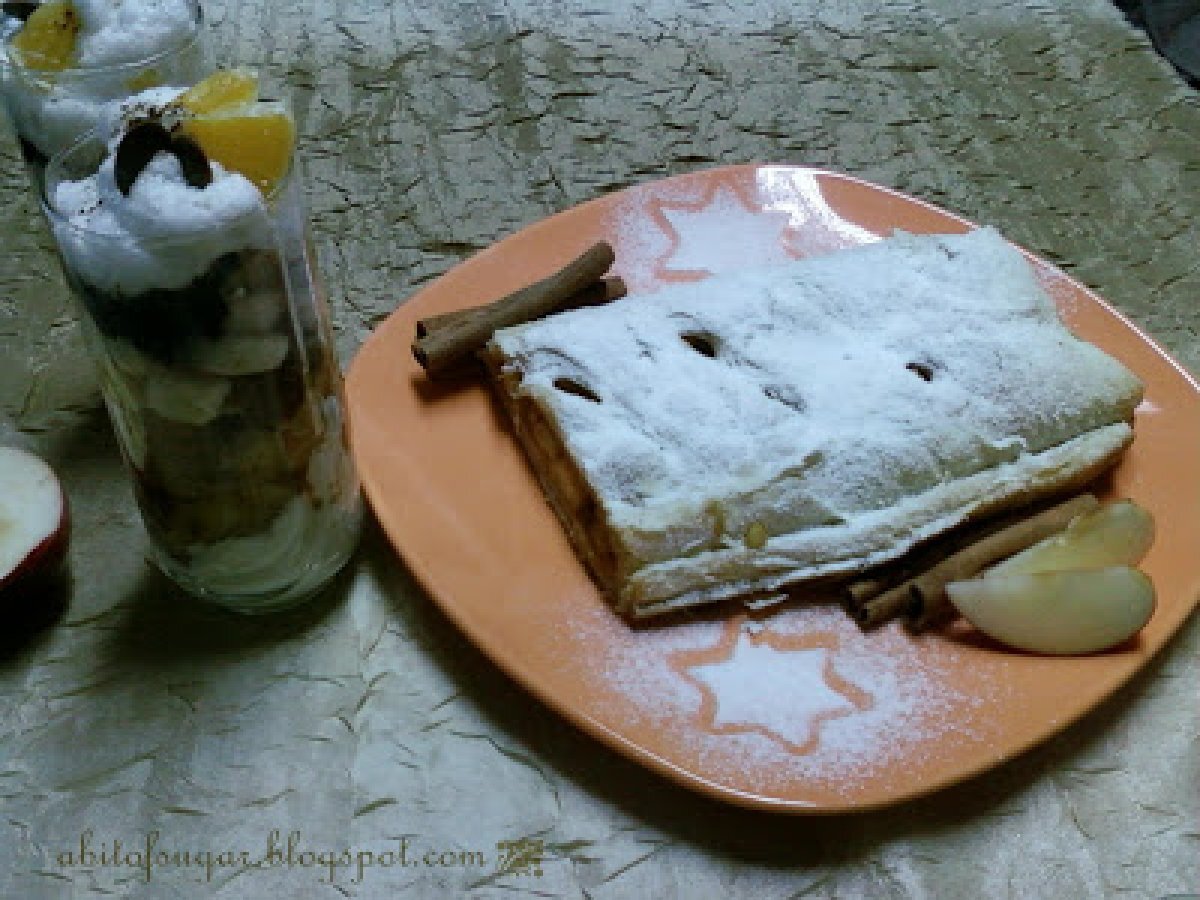 Strudel cu mere caramelizate PrecedentulUrmătorul DesertFoarte ușor45 min Trimite unui prieten Printează pagina Adresează o întrebare autorului Postează o poză cu rețeta gătită de tine Ingrediente 4 un pachet de aluat frantuzesc 5 mere 5 linguri de zahar brun zahar vanilat scortisoara zeama de la o lamaie 50g unt topit zahar pudra