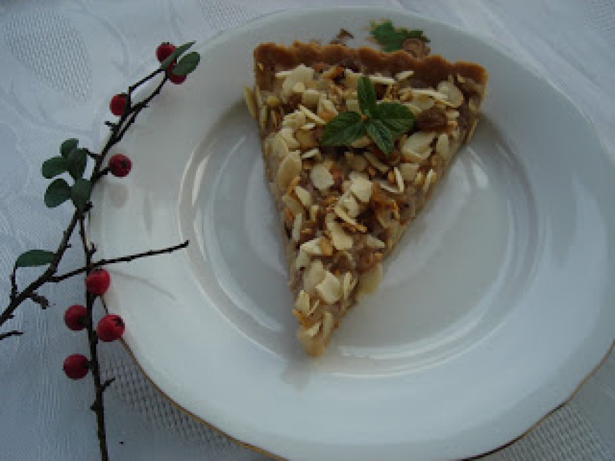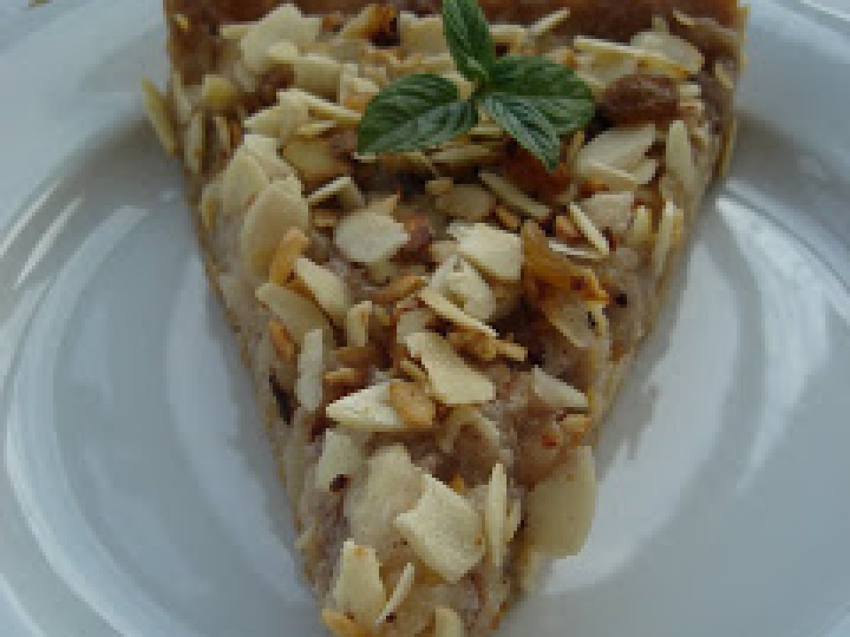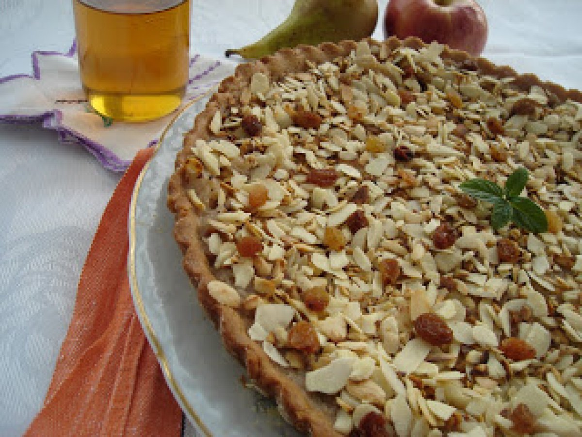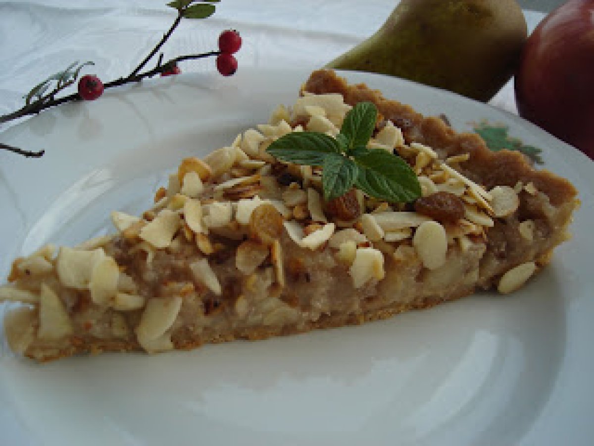 Tarta cu miere si fulgi de migdale PrecedentulUrmătorul DesertFoarte ușor55 min Trimite unui prieten Printează pagina Adresează o întrebare autorului Postează o poză cu rețeta gătită de tine Ingrediente 8 Pentru aluat: 120 g faina, 150 g zahar pudra, 50 g miere, 60 g unt, 1 galbenus, 2 linguri nuca macinata, 2 linguri de zeama de portocale, 2 linguri de coaja de portocala. Pentru umplutura: 2 mere, 4 pere, 3 linguri de nuca macinata, 2 linguri miere, 3 linguri de zeam de portocale, 1 praf de scortisoara, 80 g fulgi de migdale, 10 g stafide, frunze de menta pt.decor.