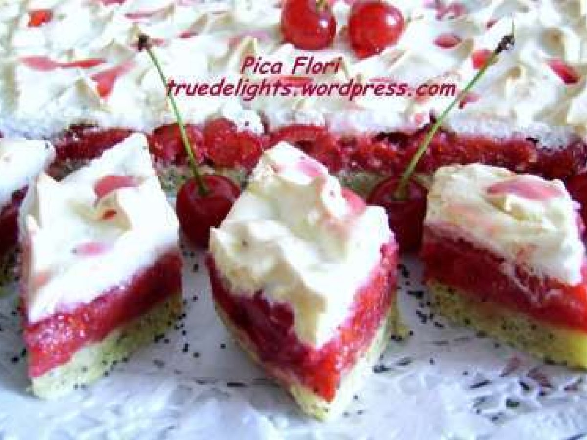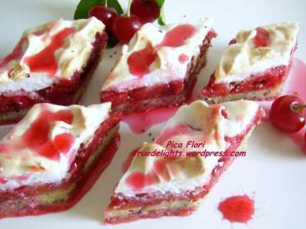 Tarta cu visine si bezea PrecedentulUrmătorul DesertUșor40 min Trimite unui prieten Printează pagina Adresează o întrebare autorului Postează o poză cu rețeta gătită de tine Ingrediente 6 Pentru blat: 3 galbenusuri 100 g unt 4 linguri zahar o jumatate lingurita cu praf de copt 3 linguri zeama de lamaie coaja rasa de lamaie 3 linguri cu mac esenta de vanilie faina 12-15 linguri 6 linguri pesmet Pentru umplutura: 500 g visine o jumatate cana zahar o jumatate cana apa 4 linguri gris Pentru decor: 3 albusuri 6 linguri zahar esenta de vanilie sirop de visine