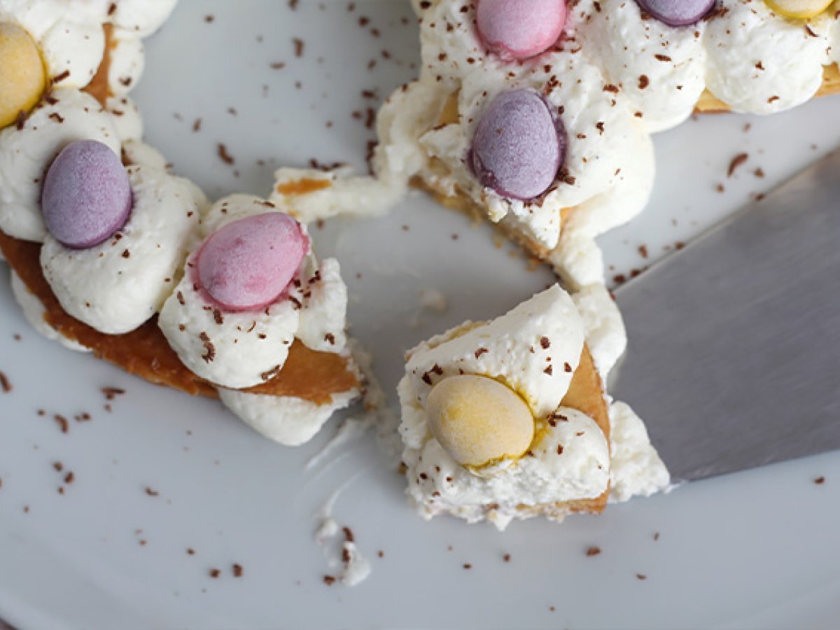 Iepurasii au iesit sa sarbatoreasca Pastele! Ei chiar va bat la usa, la ora desertului cu aceasta tarta draguta facuta cu aluat sablée si decorata cu generozitate cu frisca si mascarpone. Va trebui doar sa decorati desertul cu oua de ciocolata. Toate informatiile si detaliile de realizare, mai jos ↓